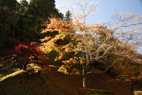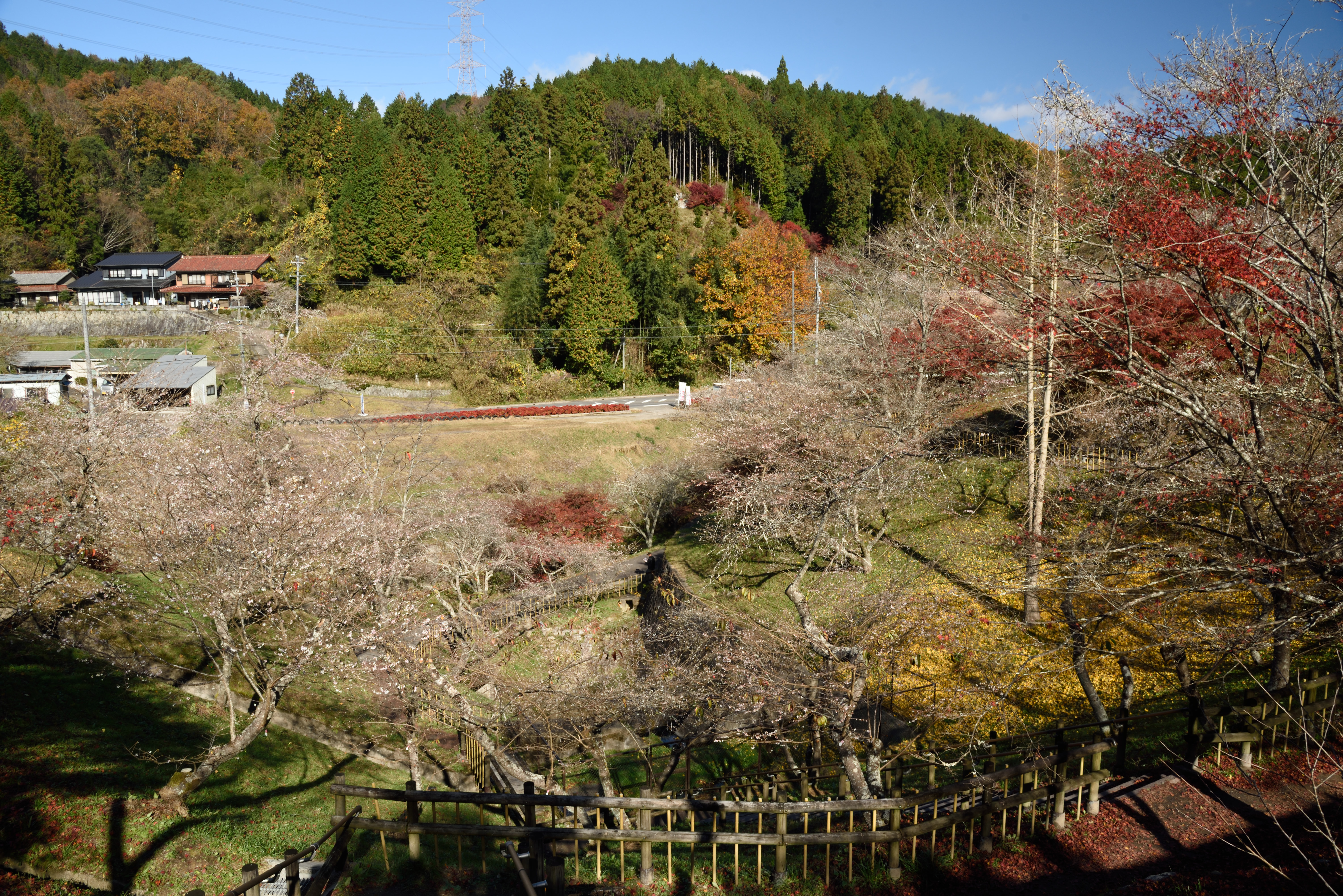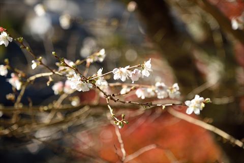 小原の四季桜 2020/11/21(5年前) 写真, 愛知, 東海 これまで何度か愛知から岐阜に入る辺りで秋や冬に咲く桜を見かけました. それは調べてみると四季桜という桜のようでした. 愛知県小原町の辺りで四季桜が多く見られるようなので行ってみました. まず行ったのは四季桜公園. 公園の周辺に開花した桜と紅葉が同時に見られました. 少し歩いて小原ふれあい公園へ. こちらは公園に続く遊歩道. 例年ではここで四季桜まつりが行われていますが今年は中止とのこと. 公園の隣の小原商工会議所前のもみじ. 紅葉も散った葉もかなり良く,日陰にあるのが非常に残念です.