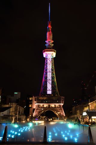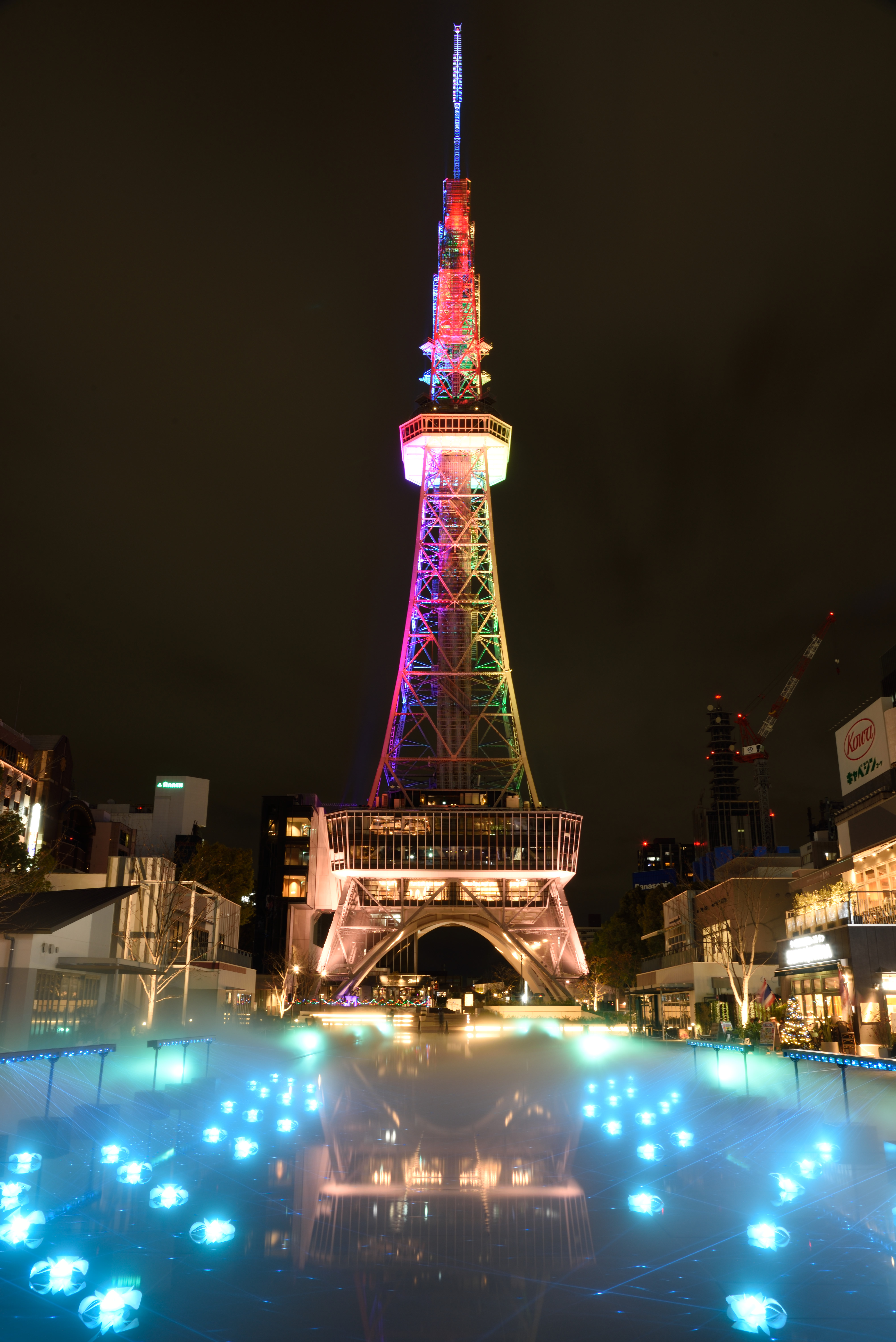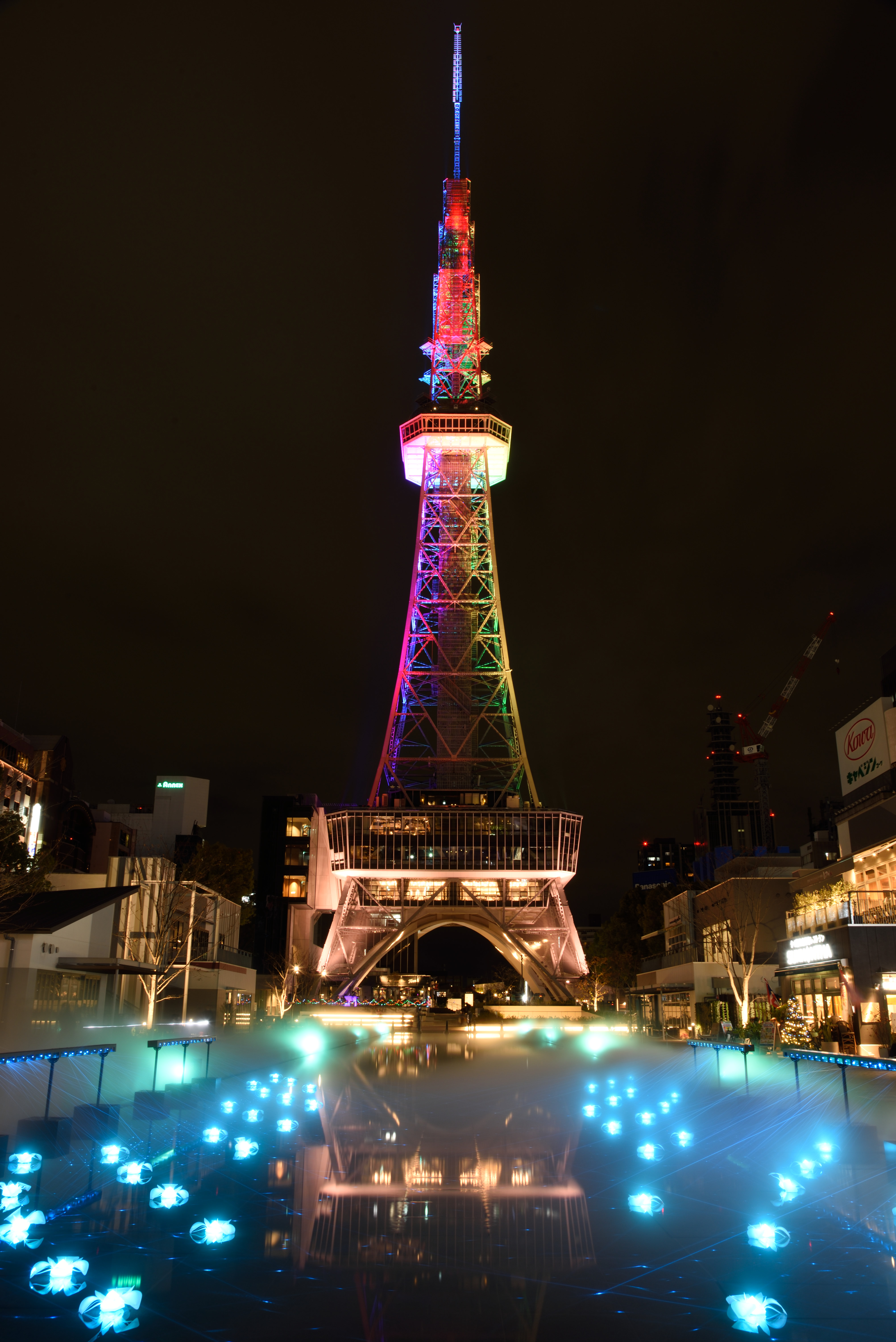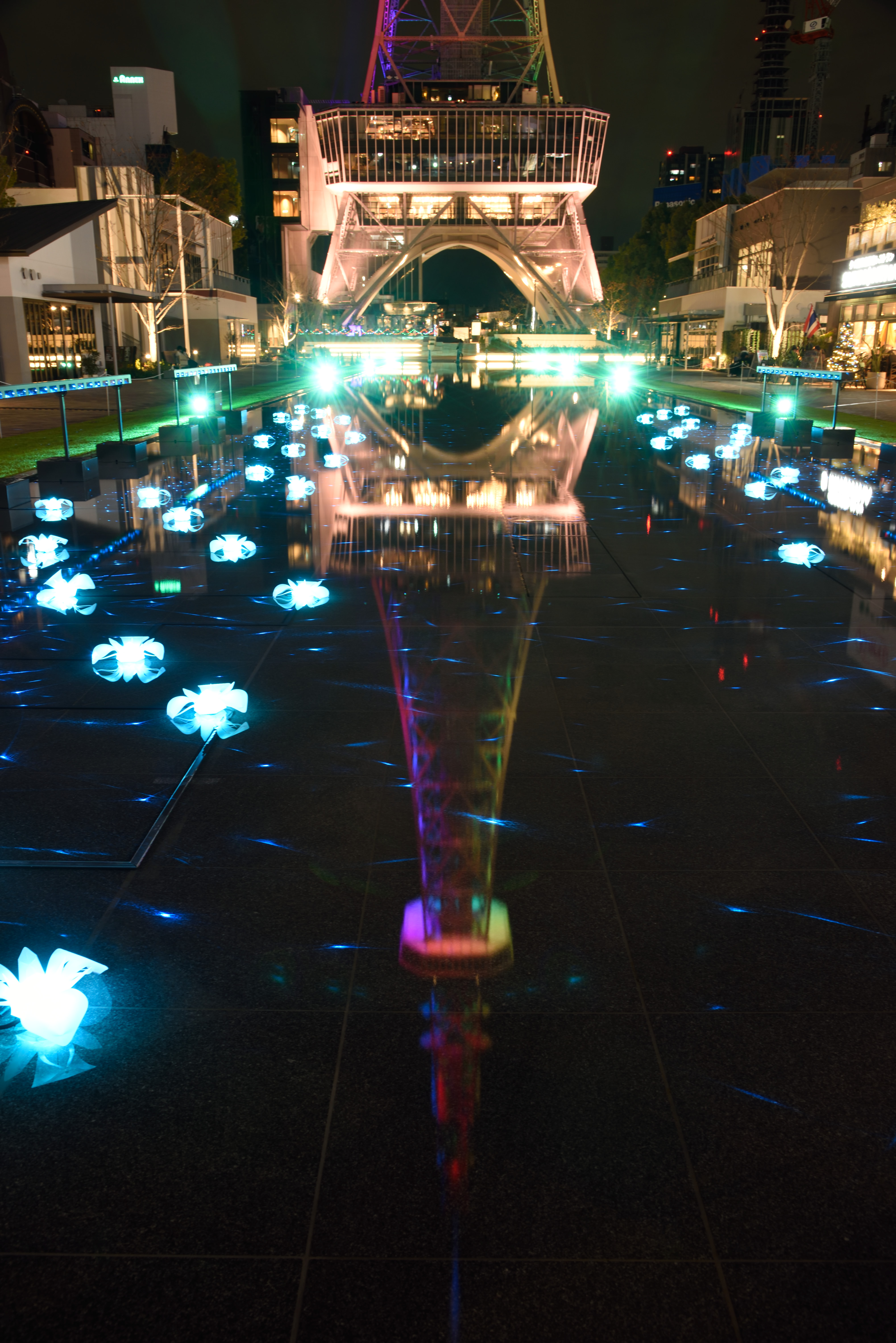再び名古屋テレビ塔ライトアップ 2020/12/4(5年前) 写真, 愛知, 東海 今回の目的その2は,前回は気づいていなかった水たまりも含めて名古屋テレビ塔のライトアップを撮影することでした. 食事してからホテルに戻り部屋で休憩し,22時過ぎに撮影したのがこちら. 時折霧を出す演出がありました. 水面に映った塔も同時に撮るのは不可能でした. 後ろに下がると柵が写ります. 水面の方を撮影.