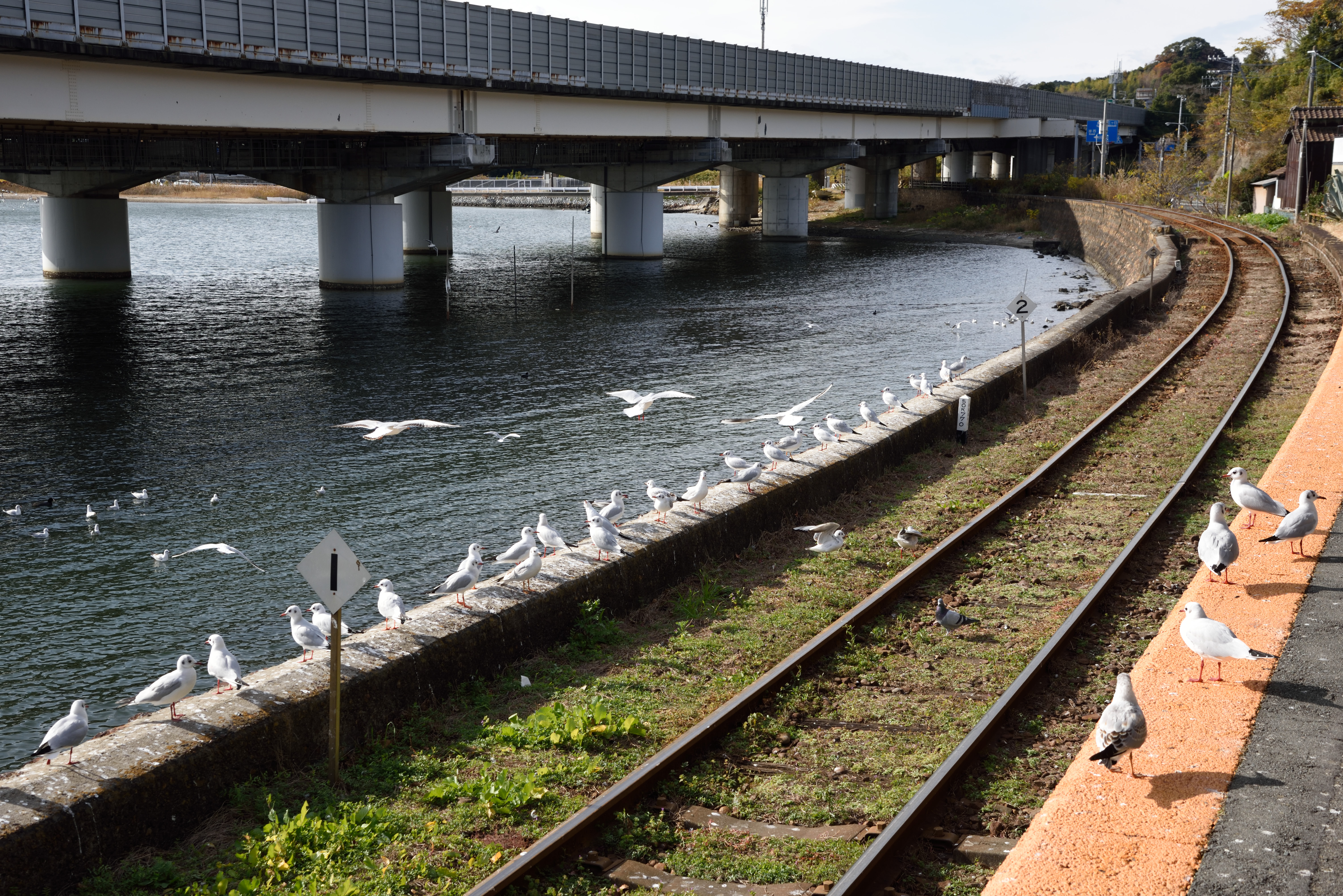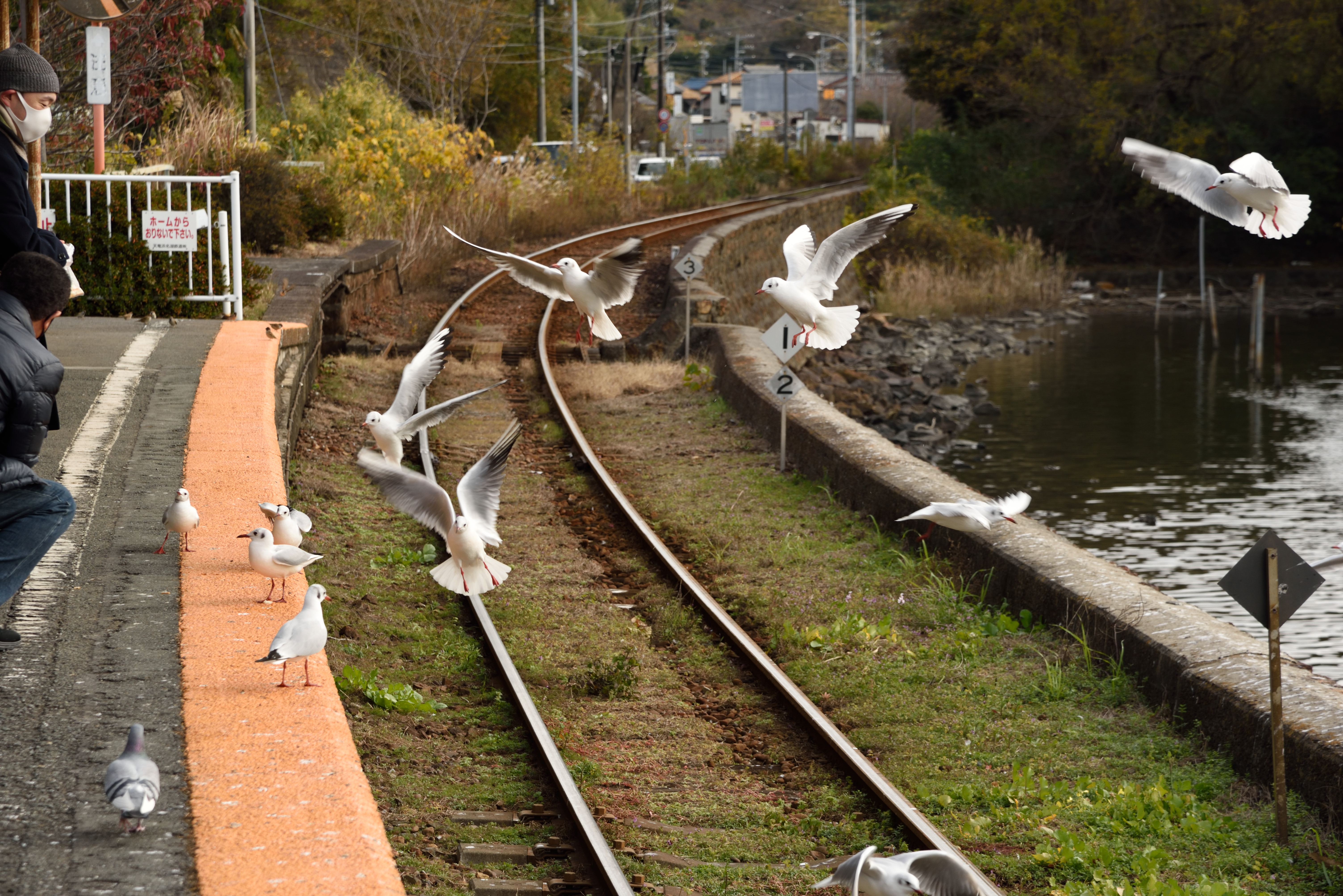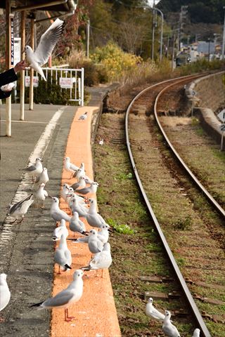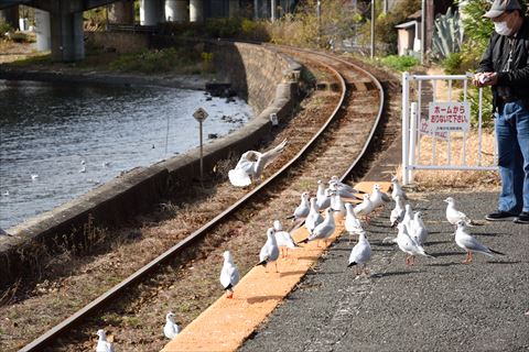 浜名湖佐久米駅のカモメ 2020/12/19(5年前) 日記 浜名湖佐久米駅に来ました. 目的は前回来たときは季節外れで見られなかったカモメです. 今回はたくさんいました. パンくずへ群がっていました. そしていよいよ電車が!・・・来ましたがカモメはいません. 遠くの湖面に浮いていました. 次の電車も待ってみました. 再びカモメが駅に集まってきました. そして電車が来ました. カモメは数羽電車の上に止まった程度で,電車の周りを飛び回る光景はみられませんでした. なぜでしょう (;_;) 相変わらずパンくずには群れていました.