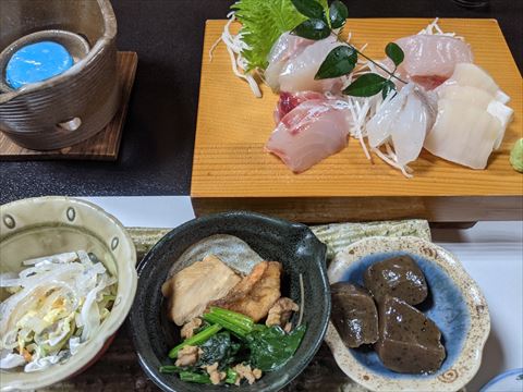 知多で海の幸 2021/1/16(5年前) 愛知, 日記, 東海 年末から引き続きGoToトラベルは停止中ですが,地域クーポンとじゃらんクーポンを使って半額以下で南知多の料理旅館 商工社に宿泊しました. 部屋から海が見えます. 目玉は当然魚料理です. 最初は小鉢と鍋と刺身. 刺身はホウボウ,スズキ,平貝その他普段は見かけない魚介がメイン. 煮魚もなんとかダイと耳慣れないので忘れてしまうような地元の魚. 焼き魚はクロダイ.