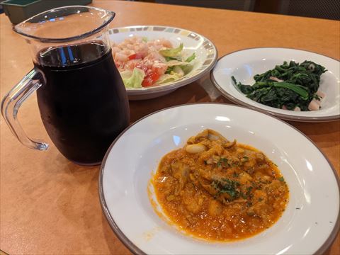 近くのサイゼリアで安ワインで酒盛り.つまみに海老サラダとイタリア風もつ煮.