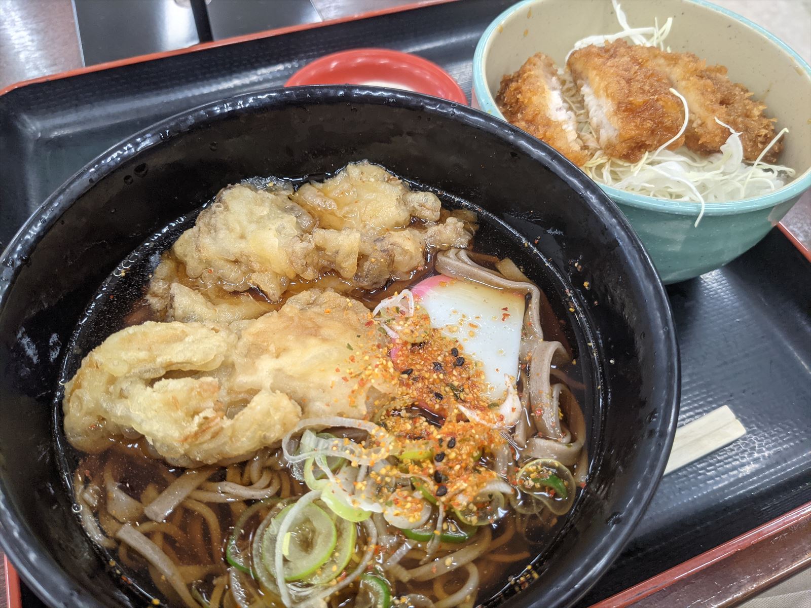 朝食はSAで舞茸の天ぷらが載ったそばとこの辺りで一般的なソースかつ丼のセットを食べました.