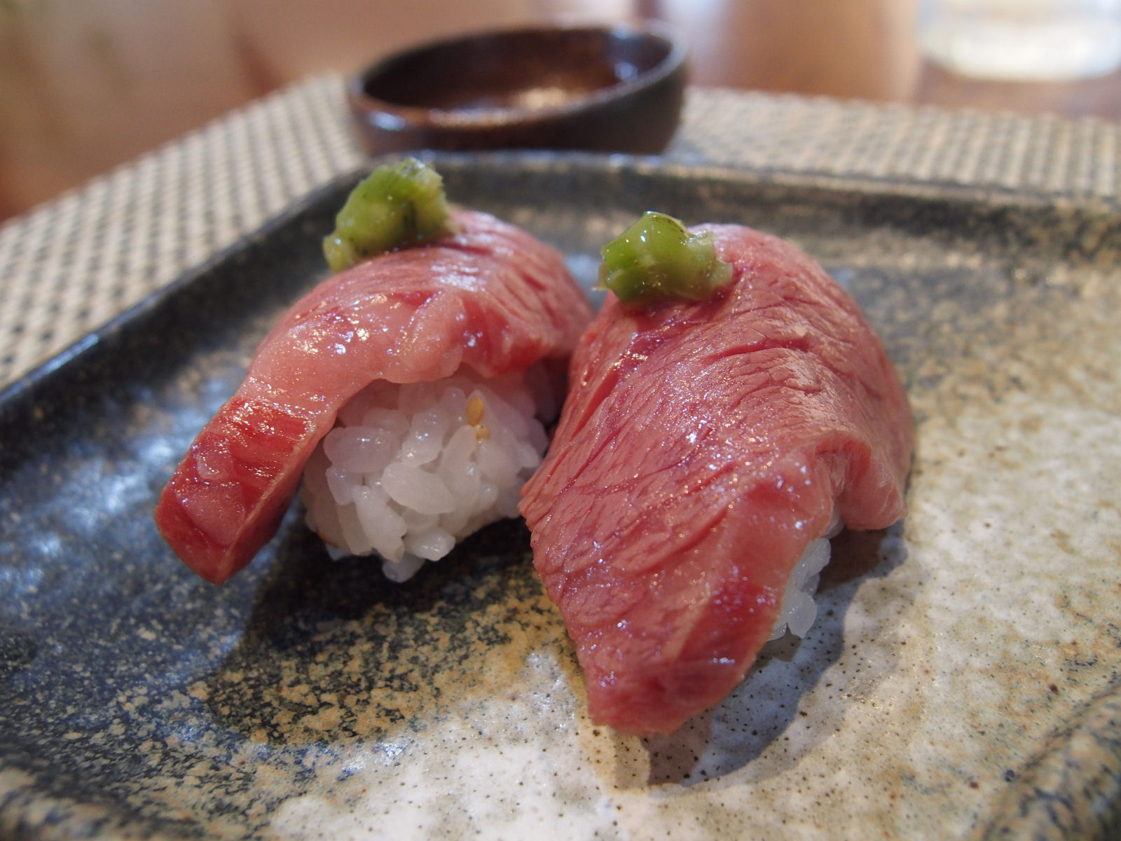 こちらは近江牛のにぎり.近江牛だからかはわかりませんが,生の獣肉はおいしかったです.