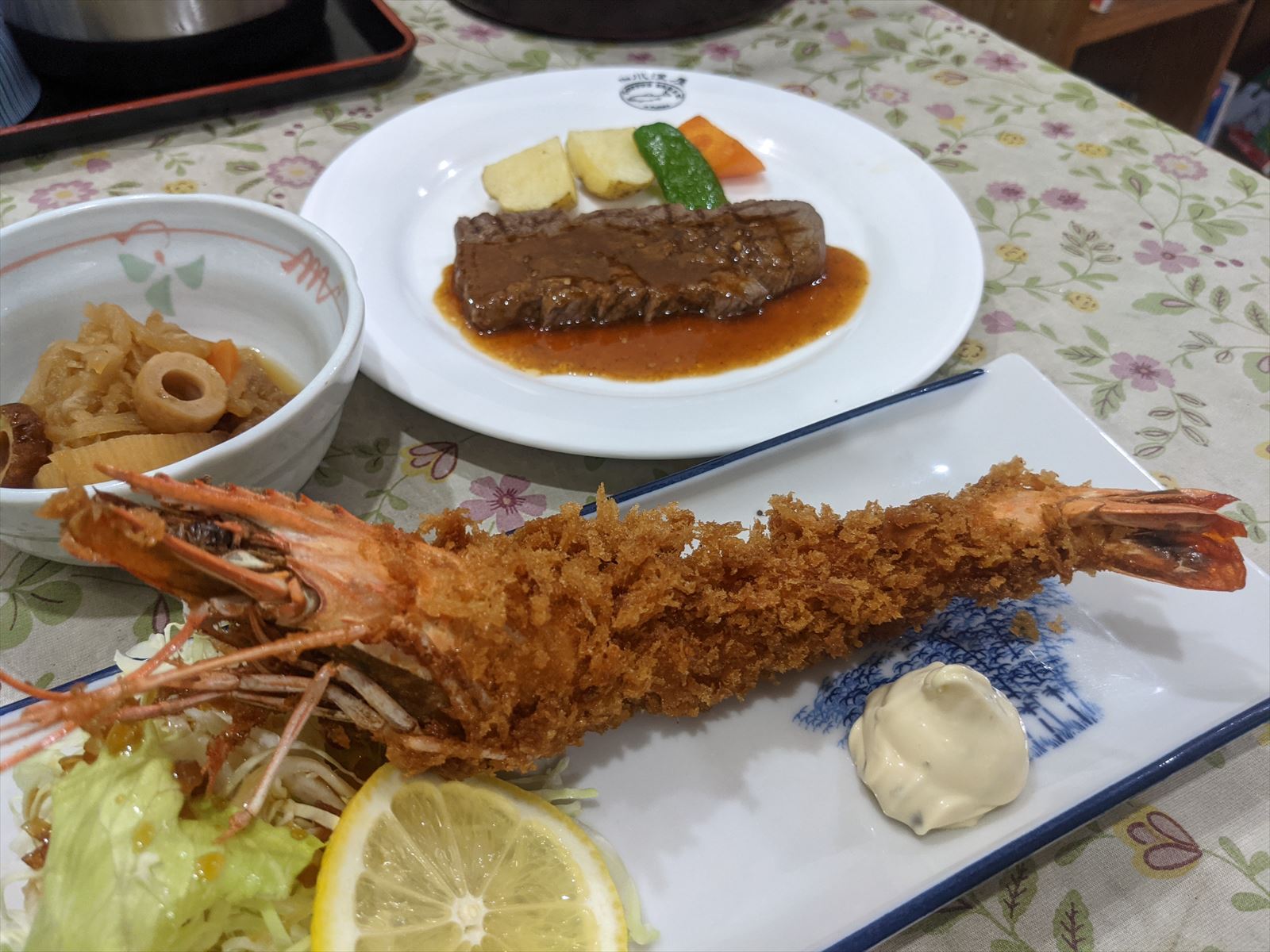 川澄屋茶房宿 2021/7/3(5年前) 愛知, 日記, 東海 今回泊まったのは矢作川のほとりにある宿泊施設併設の喫茶店,川澄屋 茶房宿. 泊まった部屋. 窓から見えるように自然の中という感じです. 廊下. 廊下や風呂は冷房が効いておらず,外と同じ蒸し暑さ.7月に入りかなりきついです. 左側に興味深い階段が見れますが,宿泊者は使用できません. 名前の通りここは料理メインの旅館で,夕飯は満足のいくものでした. 刺身と川魚,オオアサリ. 大きな有頭エビフライとステーキ.