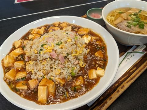 その名も麻婆炒飯.葵飯店のオリジナルメニューで,その名の通り麻婆豆腐とチャーハンが合体したメニューです.おまけにミニラーメンかデザートが選べます.