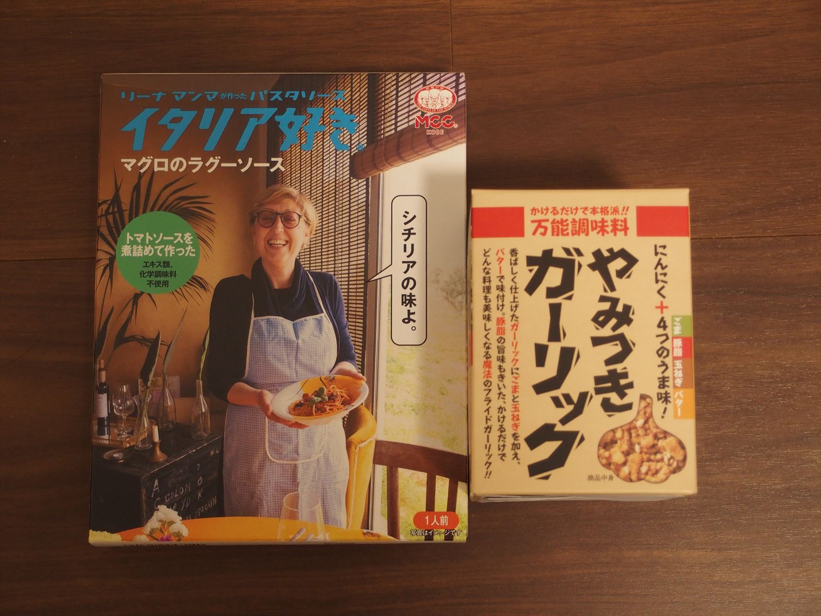 左はラジオでリスナーからのおすすめがあった,商品よりもおばさんの方が目立っているパスタソース,イタリア好きシリーズ.まだ食べていませんがおいしいそうです.