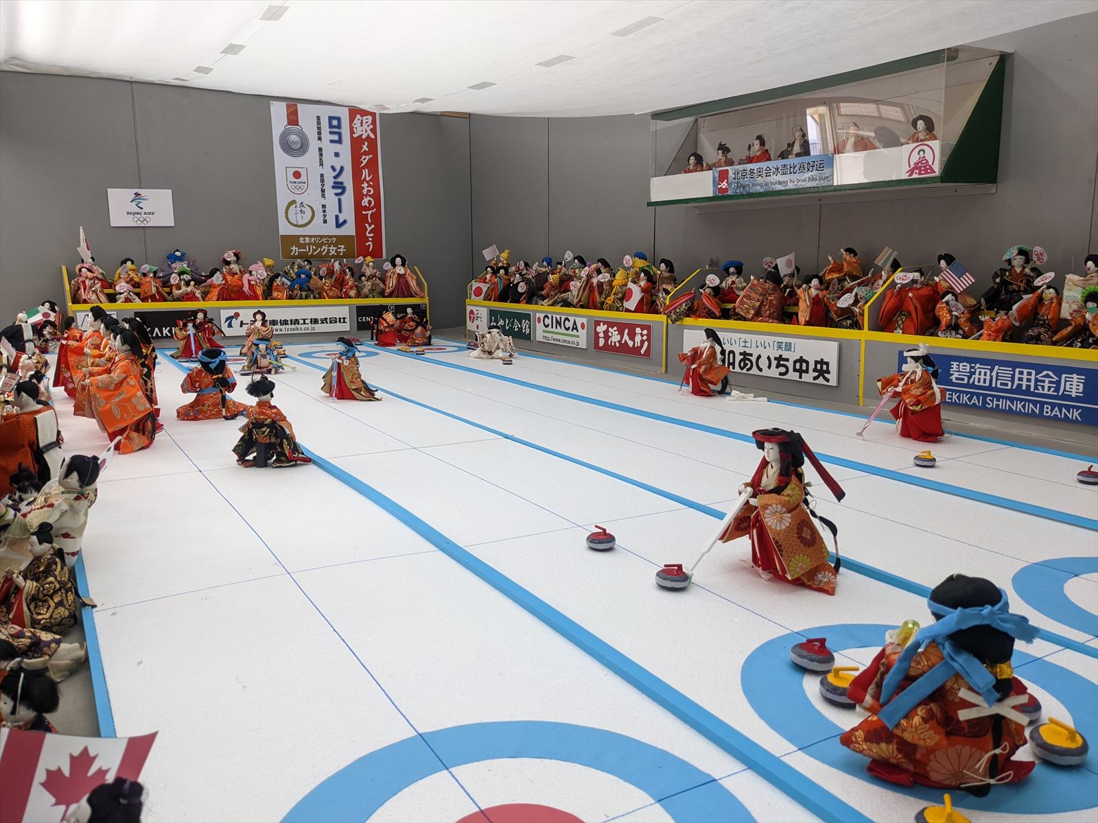 吉浜の福寄せ雛2022(1) 2022/2/20(4年前) 愛知, 日記, 東海 吉浜の福寄せ雛を見に行きました. 例年通り三河吉浜人形小路に点々と展示場があり,2つくらい規模が大きいものがあります. ひとつは藤江の渡し. めちゃくちゃ人がいます. 実際にこのような御殿はなかったと思いますが福寄せ雛ということで. もうひとつは北京オリンピックのカーリング. ちょうど日本の銀メダルが決定した頃だったようで,見ているときに銀メダルの垂れ幕が追加されました.