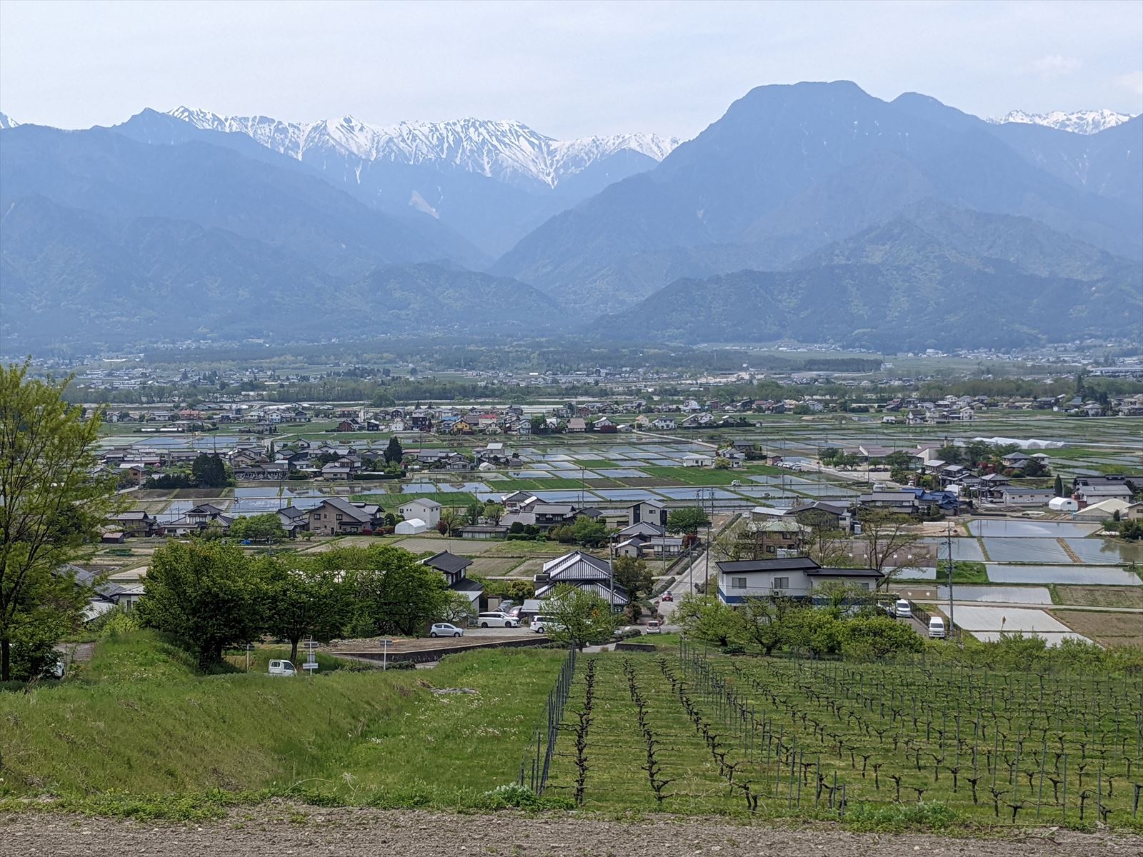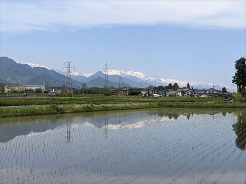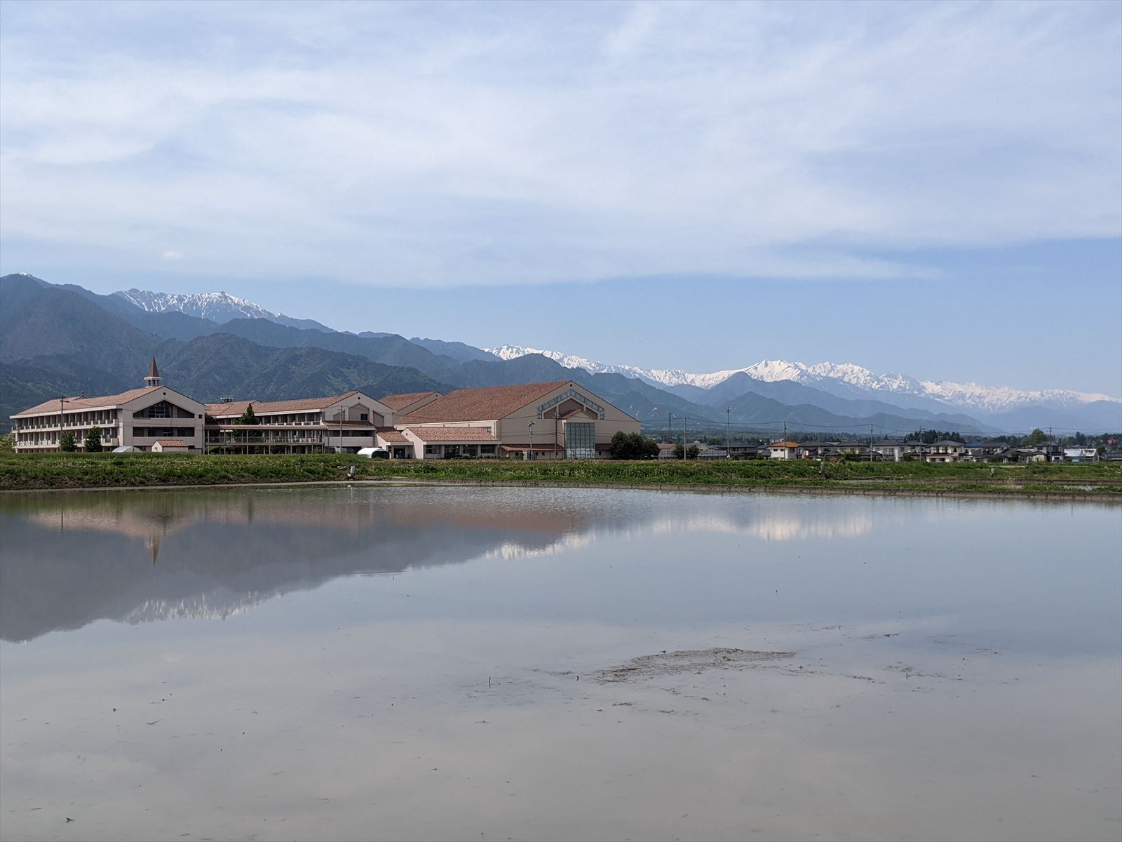 安曇野の田植えの光景 2022/5/6(4年前) 日記, 甲信越, 長野 千葉で友人と会ったとき,「安曇野では田植えと冠雪が同時に見られる」と聞いたので行ってみました. まずは安曇野の東端にある,北アルプス展望美術館の付近から. 山に雪があり,田んぼに水が張られ,タイミングばっちりです. 田んぼの近くへ移動. 北の方がより冠雪しています. 別の場所へ移動. おしゃれな学校がありいい景色でしたが,風が出て水面が波立ちきれいに映らなくなってしまいました.