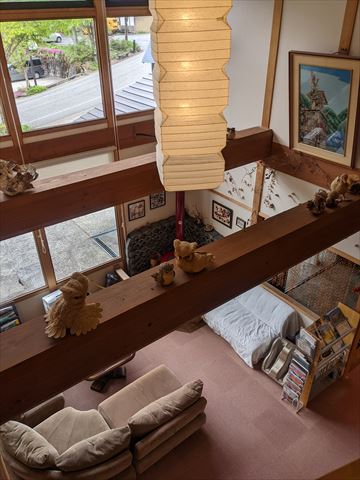 吹き抜けの梁にはふくろうのぬいぐるみが.