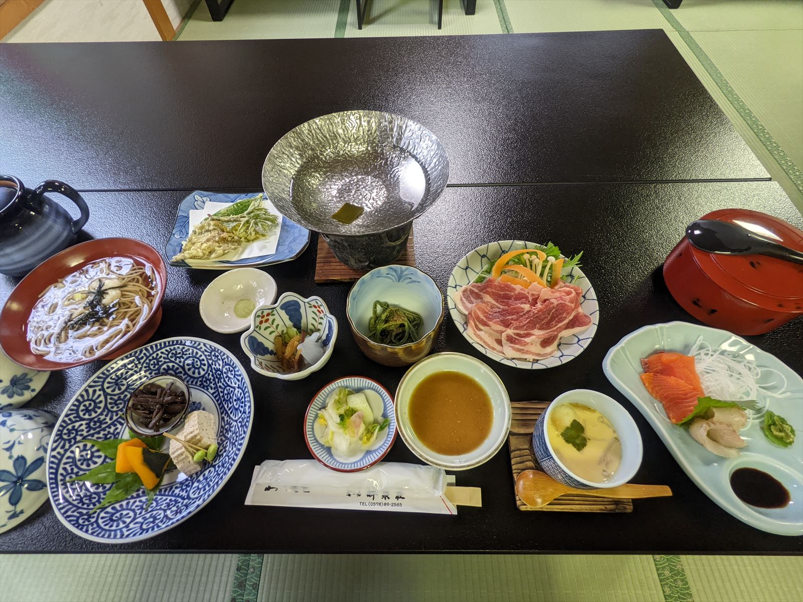 夕食.飛騨牛のしゃぶしゃぶ,山菜の天ぷら,そば,など.