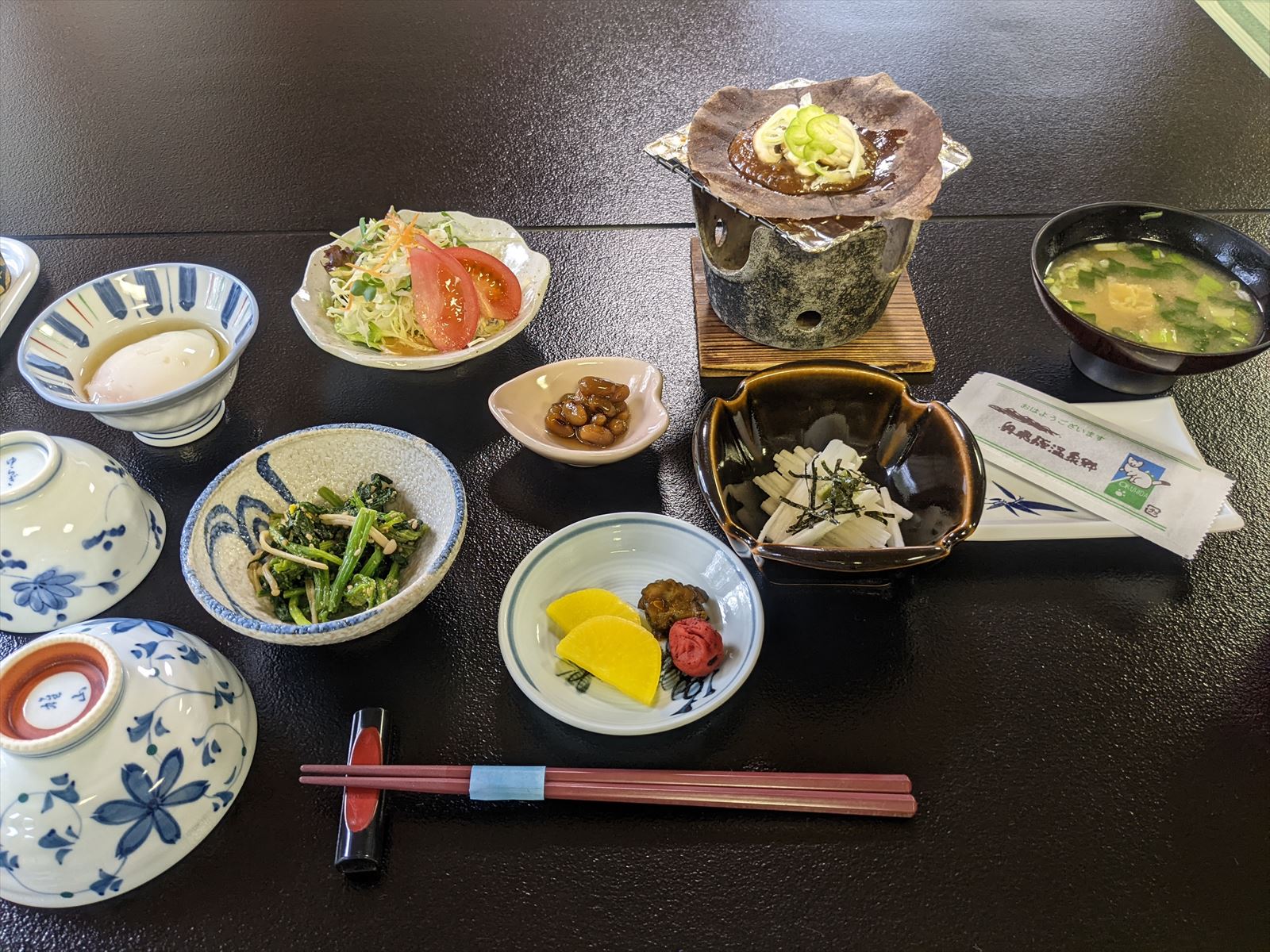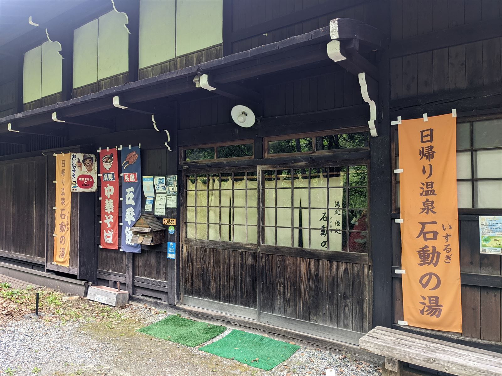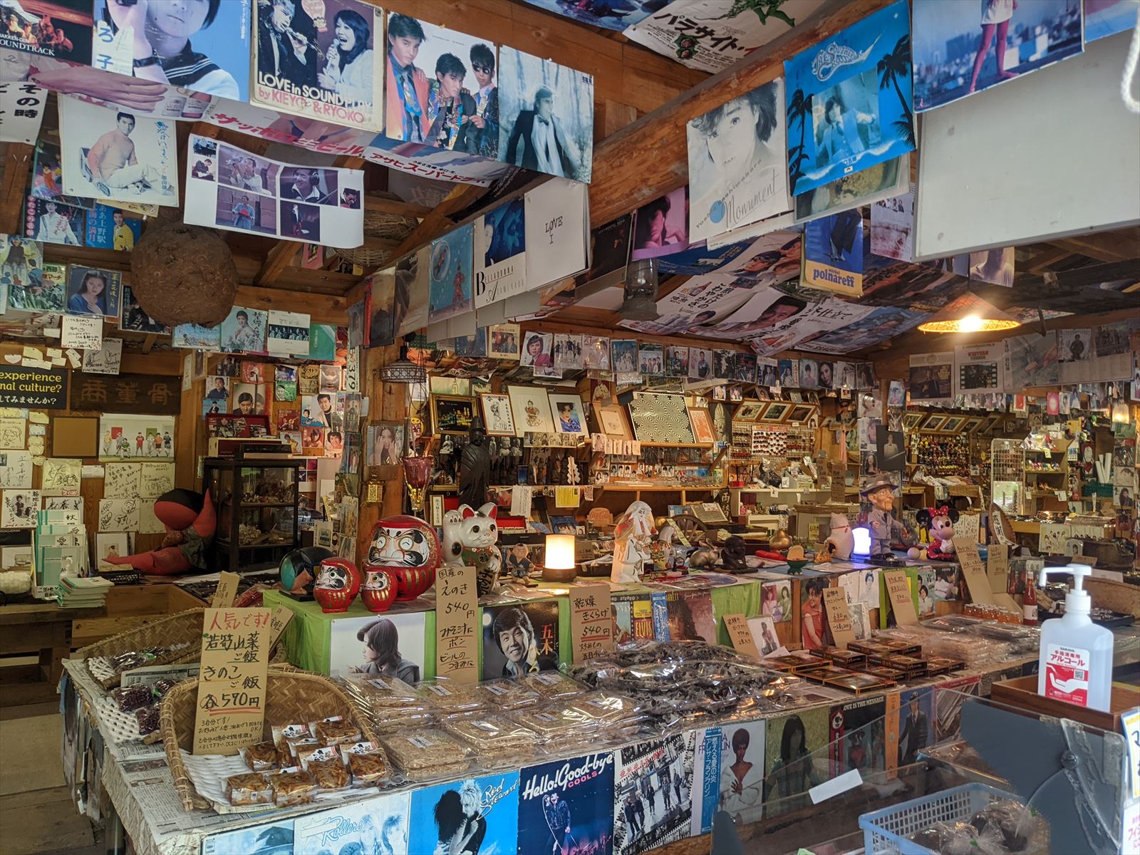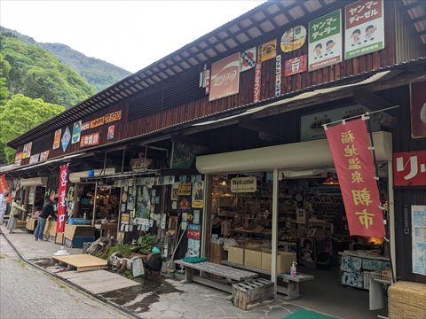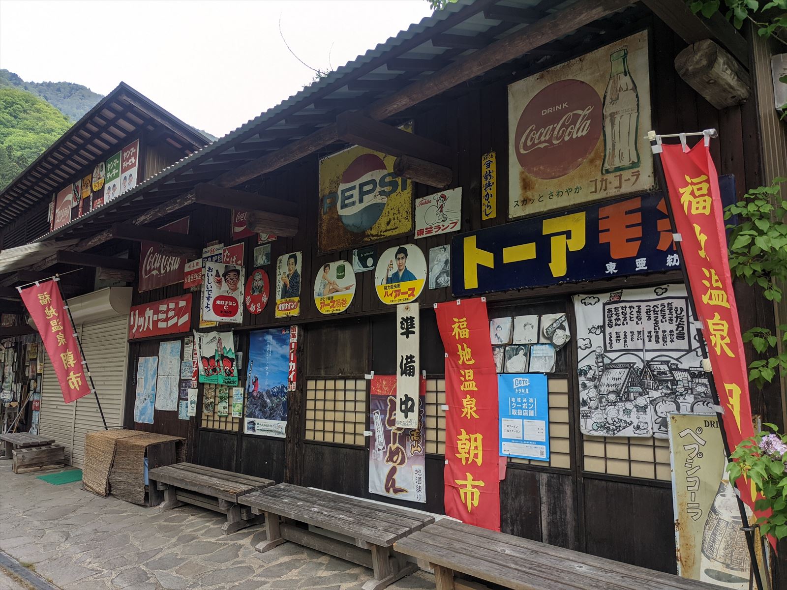 福地温泉の朝市 2022/5/21(4年前) 日記 近くに朝市があるとのことで,翌日の朝に行ってみました. 聞いてた場所に行ってみましたが・・・商店っぽいものがありました. まだ準備中とのこと.レトロな看板がバンバン貼ってあります. 時間つぶしに周辺を散策. 戻ったら空いていました. 店内は外以上にレトロなものが所狭しと陳列されていました. ぎふ割のポイントで土産をいくつか買いました. 宿に戻って朝食.
