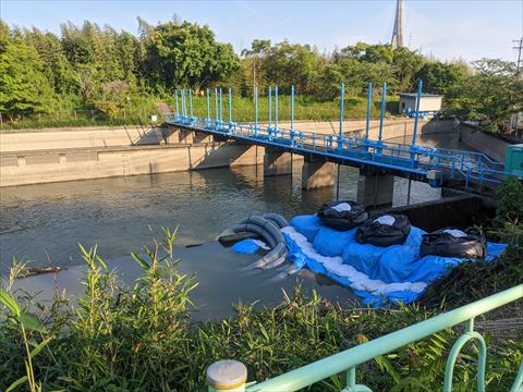 水門の横にある取水口には土嚢?とホースがありました.