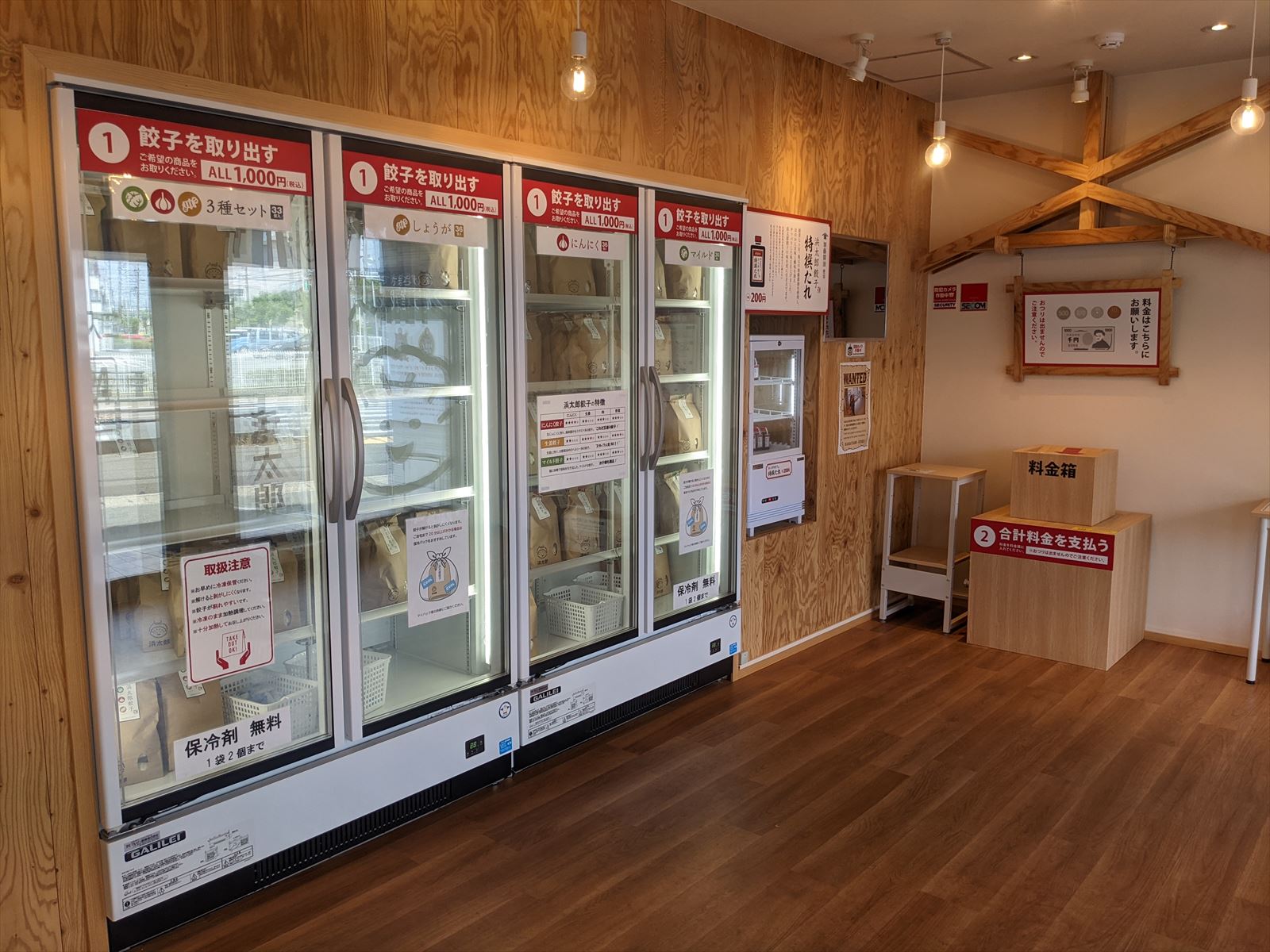 店内の様子.冷凍庫から購入する餃子を取り出して料金箱に入れます.