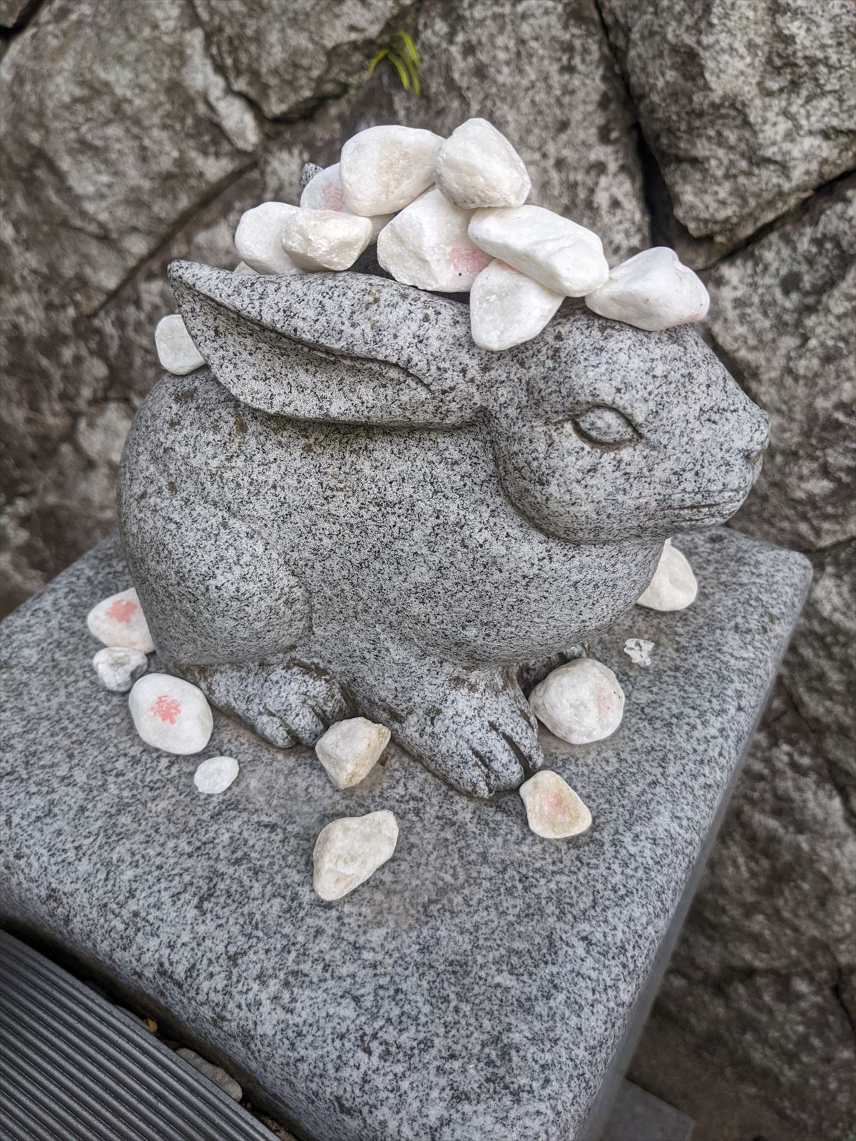 結び石がこんもり盛られた狛兎.