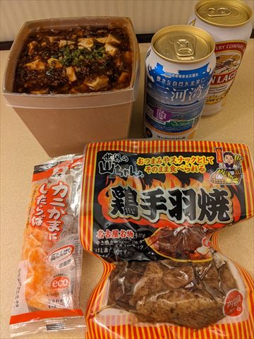 地域割り対象の店舗から選んだ結果,海上楼の麻婆丼とパックの山ちゃんの手羽焼き,三河湾ラベルのビールなどを購入.