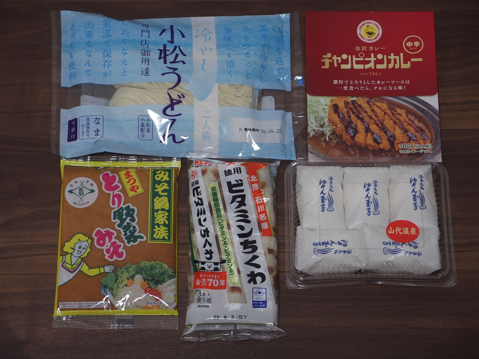 山代温泉の温泉たまご,ビタミンちくわ,とり野菜みそ,小松うどん,チャンピオンカレーです.