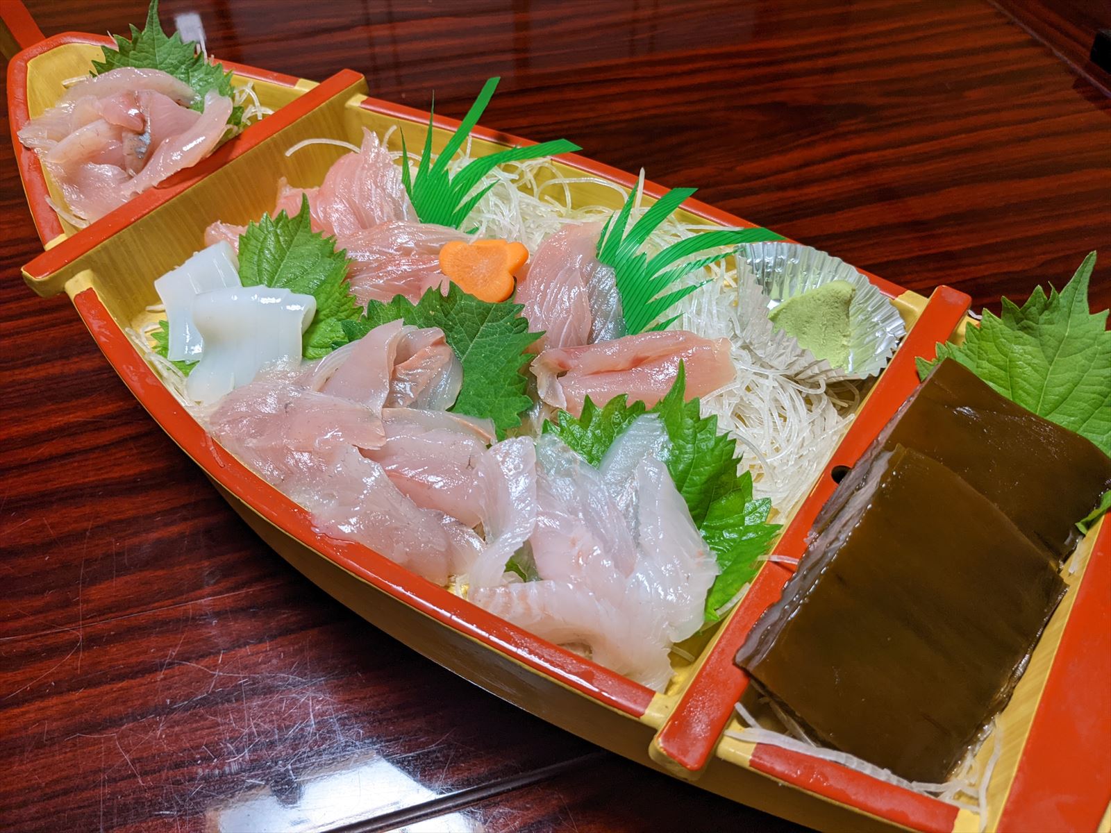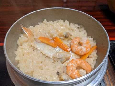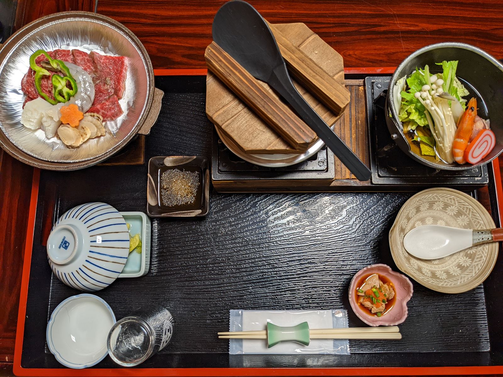 海辺の宿 女岩荘 2022/9/16(4年前) 北陸, 富山, 旅 今回泊まったのは海辺の宿 女岩荘という旅館です. 3連休の前のせいか他に1人しか客はいないそうで,海が見える一番いい部屋を用意してもらえました. この旅館を選んだ理由は料理の評判がとてもよかったからです. まず出てきたのは氷見牛の陶板焼きと海鮮みそ鍋. 舟盛デラックス.かんぱちにアオリイカに・・・覚えきれないほど種類があり量もたくさんです. 昆布で挟んでいるのはカジキとのこと. 骨まで食べられるぶり大根. 焼物はシイラ. おっきな白エビの天ぷらが入った氷見うどん. 最初からあった釜にはのどぐろの釜めし. 氷見の食事を十分堪能しました.