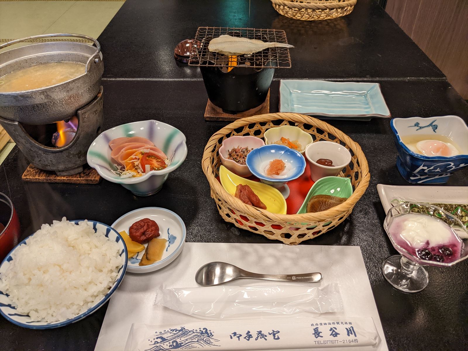 越前あわら温泉 長谷川 2022/10/7(3年前) 北陸, 旅, 福井 福井の宿泊割であわら温泉の長谷川に宿泊しました. フロント.レトロな感じです. フロント横にあった真田幸村と黒田官兵衛. マンガと時計が置かれた棚. 部屋.めずらしく茣蓙でした. 食事. 若干種類が少なめですがビジネスプランであることを考えるとお値打ちです. 朝食. 適度な量に豊富な種類で,その場で焼く魚もあり満足です. チェックアウト時にが適用されなかったので指摘したら,宿のHPから予約しないと適用されないとのこと. 予約前に宿泊割や予約サイトや宿のHPをよく確認していたのですが,聞かないとわからないというケースは初めてです. 結局予約サイトの方はキャンセル扱いとして宿泊割を適用する対応してもらえました.