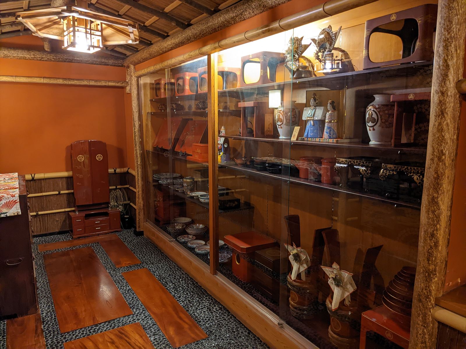 こちらは4階エレベーター前の展示.歴史を感じる食器や飾りです.