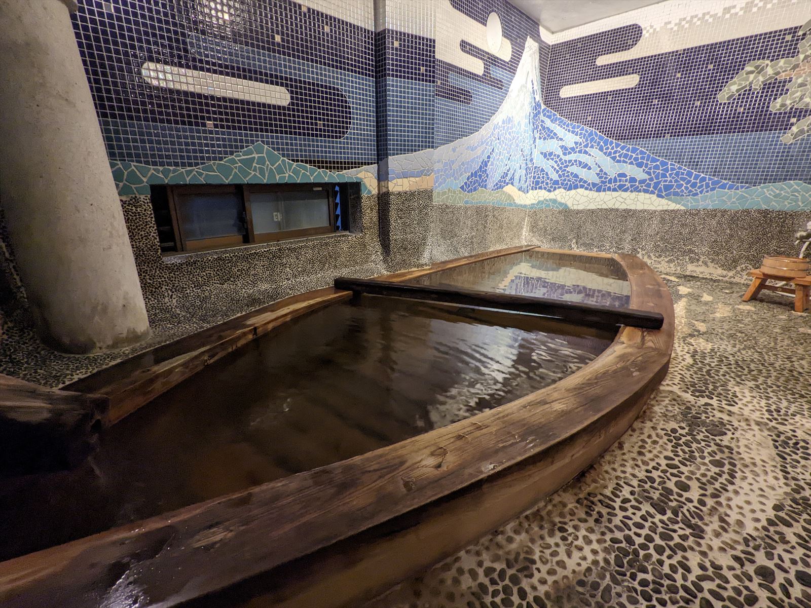こちらは貸切風呂の中で最も内装が豪華な斉月の湯.富士山のタイル画があり,湯舟が舟形です.風呂はここだけ撮影可と書かれていました.