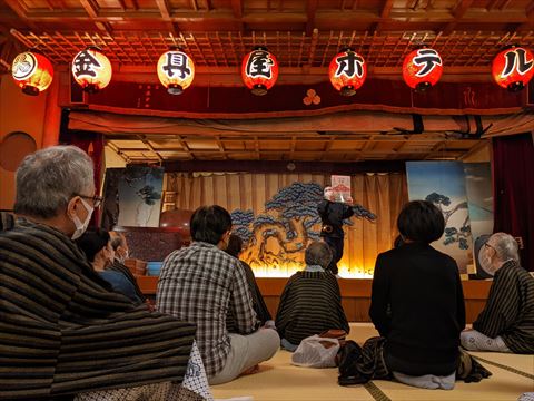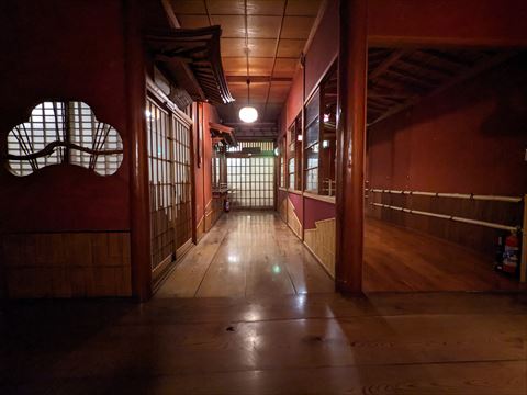 大広間は200人以上を受け入れられるよう130畳という巨大さで,舞台を見るのに邪魔になる柱を立てないように当時最先端のトラスト構造を採用しているとのこと.