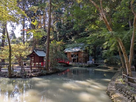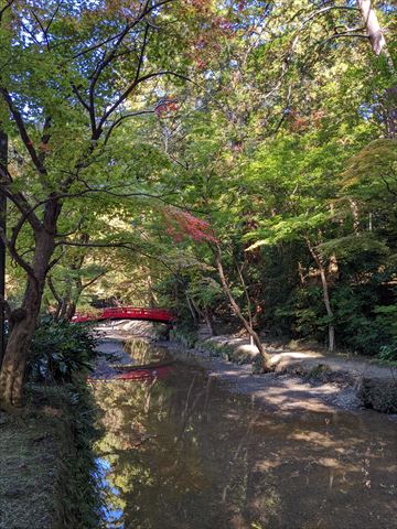 神社の近くを流れる小川に沿ってもみじが植樹されていて,一部が紅葉していました.