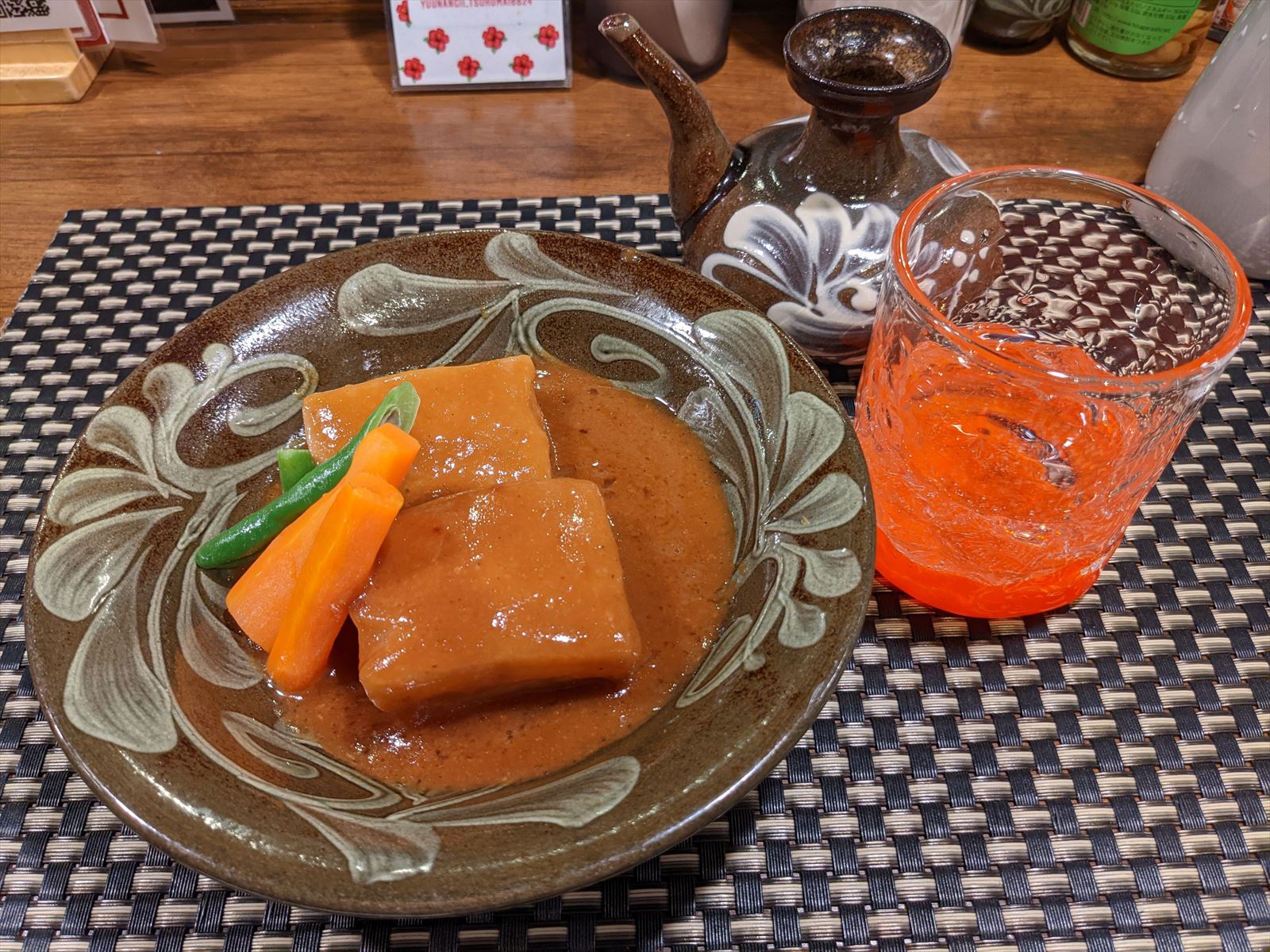 まず来たのはラフテー.そういえば沖縄ではてびちは食べましたがラフテーは食べていませんでした.味噌味で名古屋仕様かと思いましたが,沖縄のラフテーも味噌味のようです.