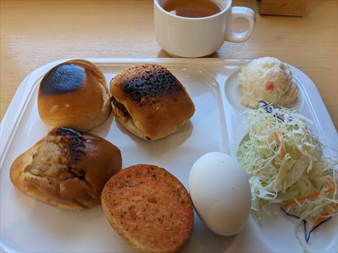 ホテルの朝食はパンのみでご飯やおかずはありませんでした.正確には野菜とポテトサラダとゆでたまごがありますがはっきりって名ばかりの朝食付きでしょぼいです.