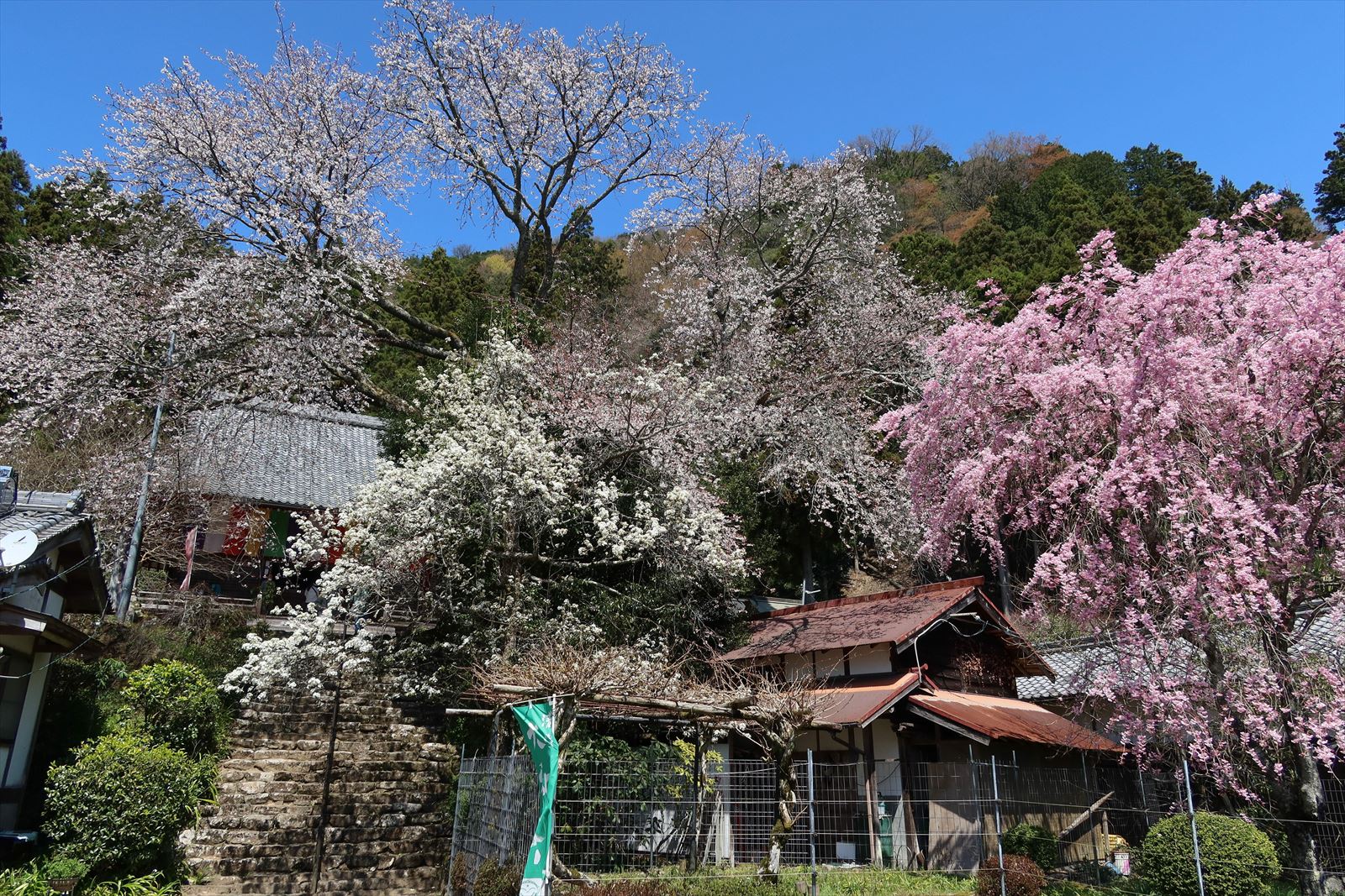 佛隆寺の千年桜 2023/4/1(3年前) 奈良, 旅, 近畿 この日は奈良の桜巡りです. 最初は佛隆寺の千年桜.本堂への階段の途中に立派な桜. 県下最古の桜とのこと. 境内. 見ごろ手前くらいに開花していますが前日までは2分咲だったとか. 本堂. 850年に空海の高弟・堅恵により創建されたと伝わる古刹. 帰りの別ルートから撮影した桜.