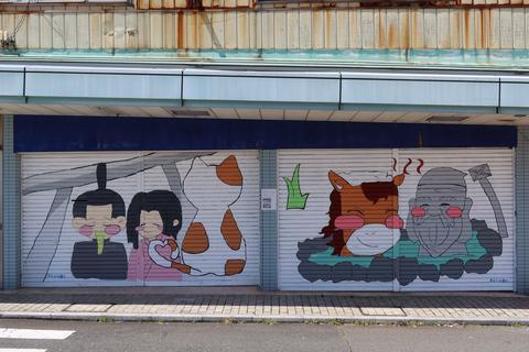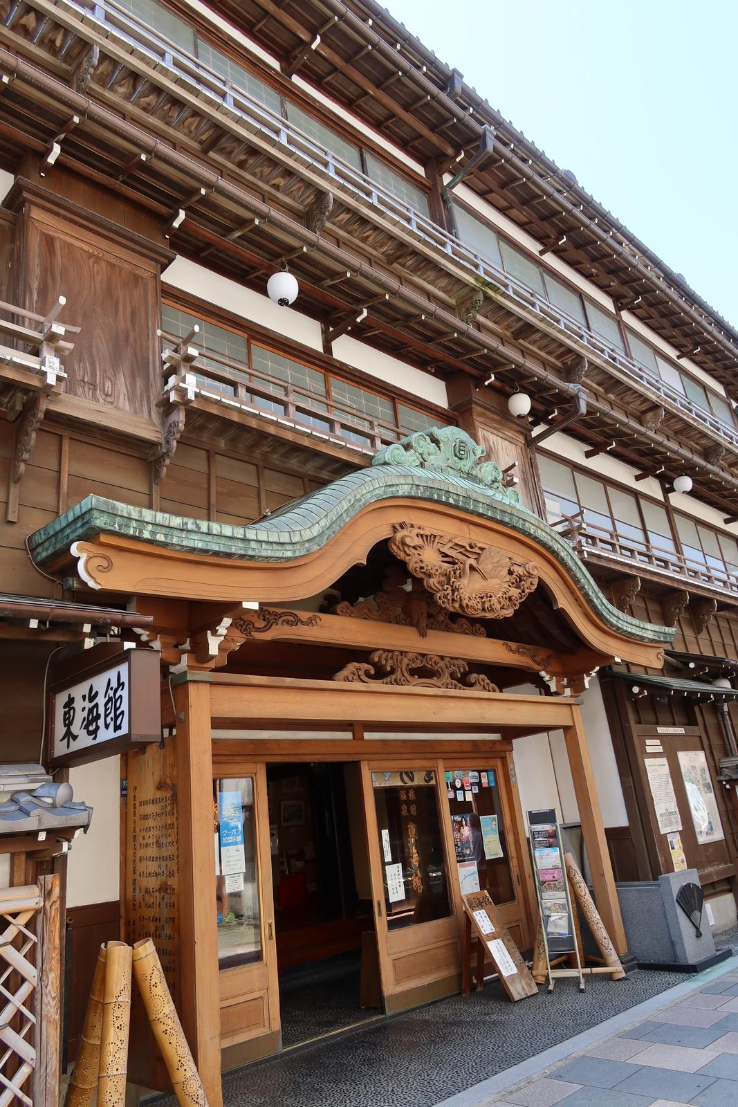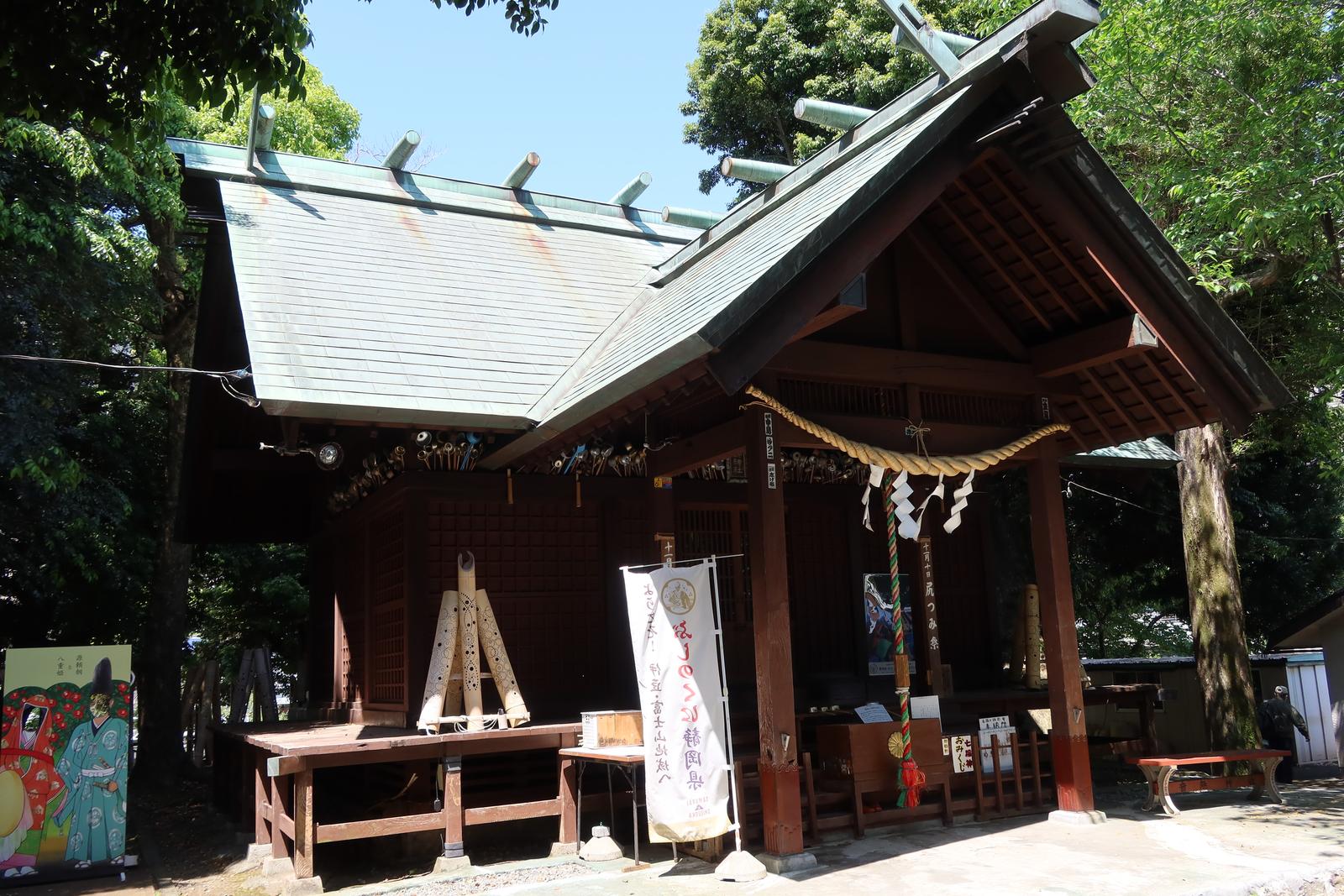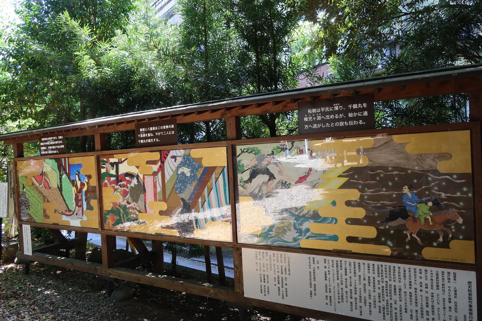 伊東を散策 2023/5/2(3年前) 旅, 東海, 静岡 チェックアウトして伊東を少し散策しました. がっつりペイントされたバスが走っていました. 伊東の代表建築物,東海館. 玄関. 音無神社. 今回泊まった音無の森緑風園と隣接しています. この神社で源頼朝と八重姫が密会したという言い伝えがあります. 町の店のシャッターにもその絵がありました.
