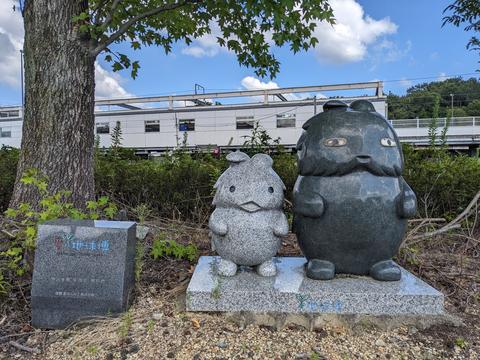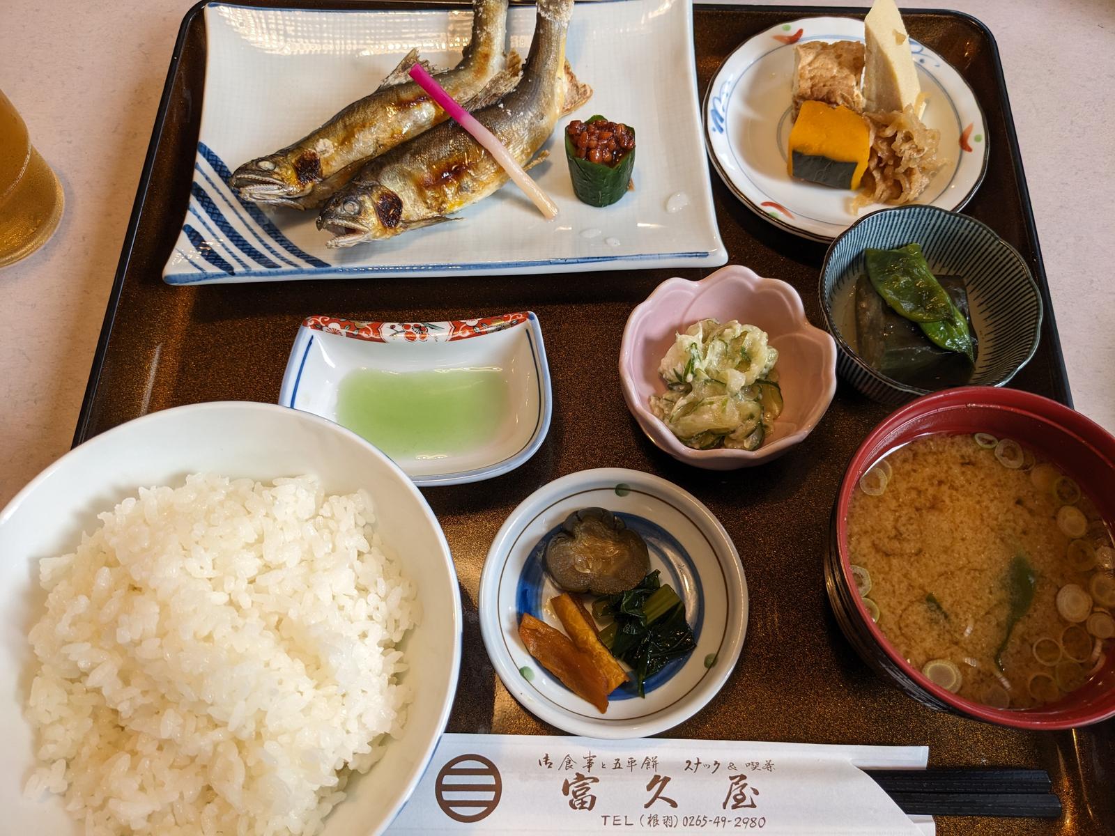 豊田市周辺をうろうろ 2023/9/9(3年前) 愛知, 東海, 甲信越, 長野 この日は豊田市周辺を目指してうろうろしました. 昼にはリニモの終着駅,八草へ. あいち博関連ということでモリゾー・キッコロの像がありました. ただ駐車場の中にあるのでリニモに乗る人からは見つけにくいと思います. 夕方には豊田市を出て長野に入ってすぐ,根羽村の店 富久屋 に入りました. 定食があるので和食的な店かと思っていましたが, 喫茶店風なカウンターと・・・ スナックのようなカラオケ席. 地方なのでいろいろ兼ねた店なんですかね. 窓から木々の間を流れる川が見えます. そんな場所で焼き鮎定食を注文.