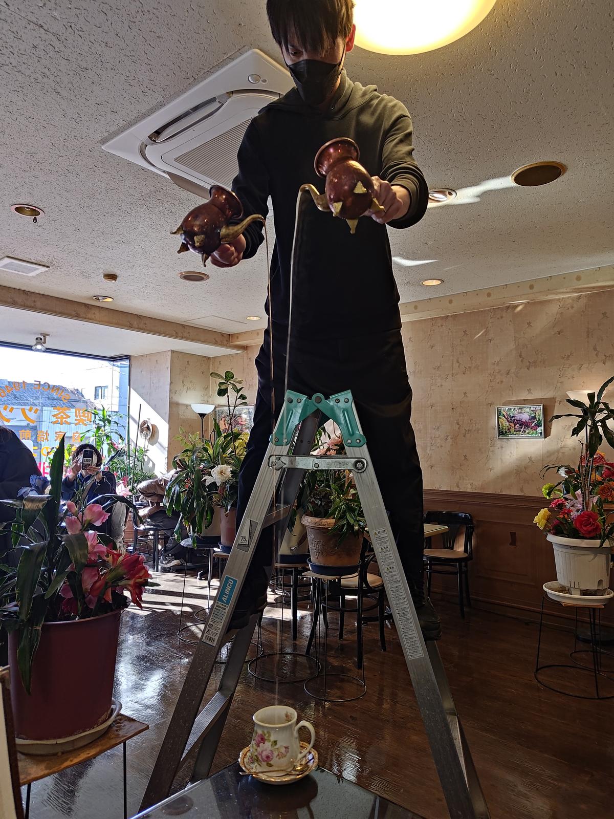 ときたま店員がはしごをもって何やらしていて,聞けばカフェオレを頼むとパフォーマンスをしてくれるとのこと.