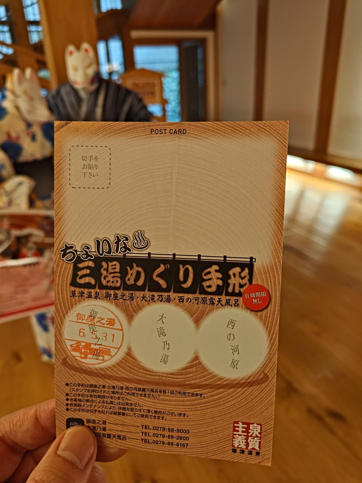 草津で合流 2024/5/31(2年前) 旅, 群馬, 関東 千葉の友人と草津で合流しました. 待ち合わせに使った道の駅 草津運動茶屋公園.メルヘンチックな建物です. 群馬名物のひもかわうどんが売っていました. 食べてみたいと思っていたので即購入しました. 合流してから草津の温泉街へ. 草津には無料の共同浴場がいくつかありいつもはそこに入っていましたが,今回は有料の御座之湯に入ってみました. 他の有料の温泉の入場もセットになっている手形を購入しました. 無期限なので今後また来て入ろうと思います. 湯舟は普通でした 2階は畳敷きの広い休憩場. 草津温泉街の中心が見えます.