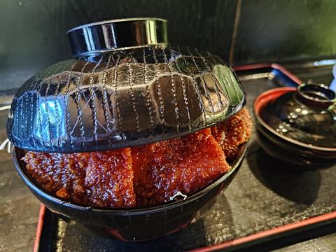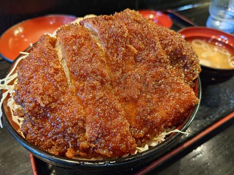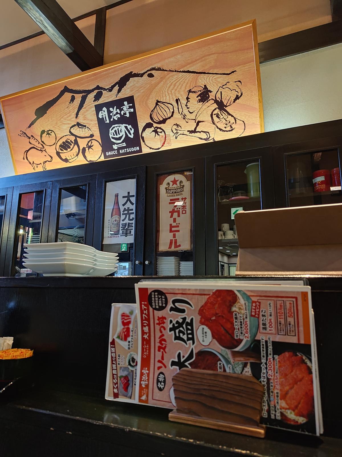 ソースカツ丼@明治亭駒ヶ根本店 2024/9/7(2年前) 旅, 甲信越, 長野, 食べ物 木曾から伊那の方へ行き,マップソフトになぜか印がついていたソースカツ丼の店 明治亭 駒ヶ根本店に行きました. カウンターに案内されました. 趣のある看板です. ロースソースカツ丼を頼みました. 丼とふたの隙間からソースカツがのぞいています. ふたを開けるとボリューミー. 会計で入口に行くとたくさんのサインが. その中にあるせっかくグルメの人形を見てなぜ印をつけたかわかりました.