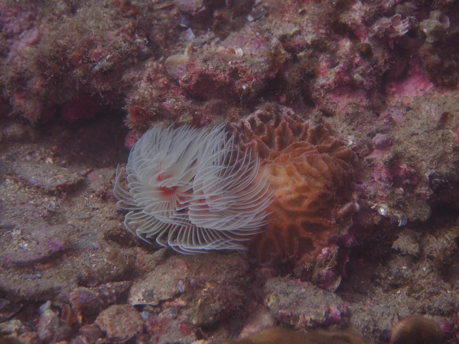南紀白浜でダイビング ビーチ 2024/10/13(1年前) ダイビング, 和歌山, 近畿 地元ダイビングショップのツアーに参加しました. 行先は南紀白浜です. 1本目はビーチダイビングです. ちょくちょく生物を見かけました. カラフルなソラスズメダイ. きれいな見た目だがゴカイの仲間,オオナガレカンザシ. 小さくて見つけるのが大変なニジギンポ. 同じく小さなコイボウミウシ. カサゴ. ミノカサゴ. 上がるとき浅瀬に大量のウニを見ました.
