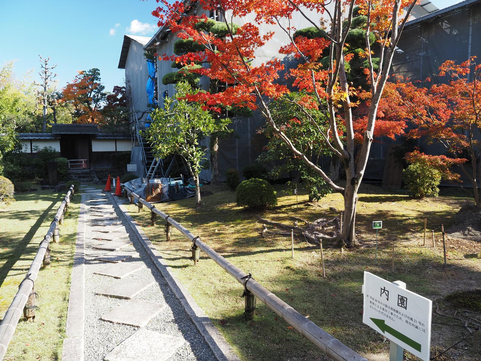 松花堂庭園 2024/11/30(1年前) 京都, 写真, 旅, 近畿 松花堂弁当を食べ終わった後,せっかくなので松花堂庭園も回りました. 八幡という土地のせいか竹が多く見られます. 鹿威し. 葉が細い紅葉. 盆栽のような松. 内園は台風の被害により修復中. この日も青空で紅葉が映えます.