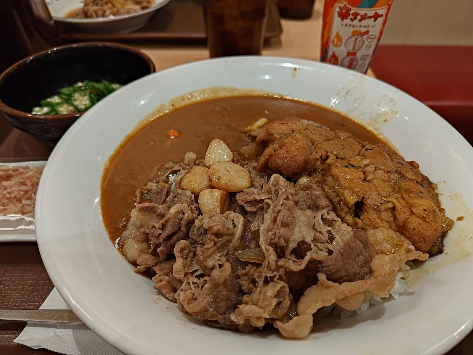 にんにくやわらかチキンカレー牛あいがけ@すき家 2024/11/30(1年前) 食べ物 世間では一般的なのでしょうが自分は食べた記憶がない牛丼屋のカレーを食べにすき家へ行きました. 頼んだのはにんにくやわらかチキンカレーに牛あいがけを追加. かなり食べ出がありました.この前食べたホロ肉どかんとBBQカレーより腹にたまった気がします.