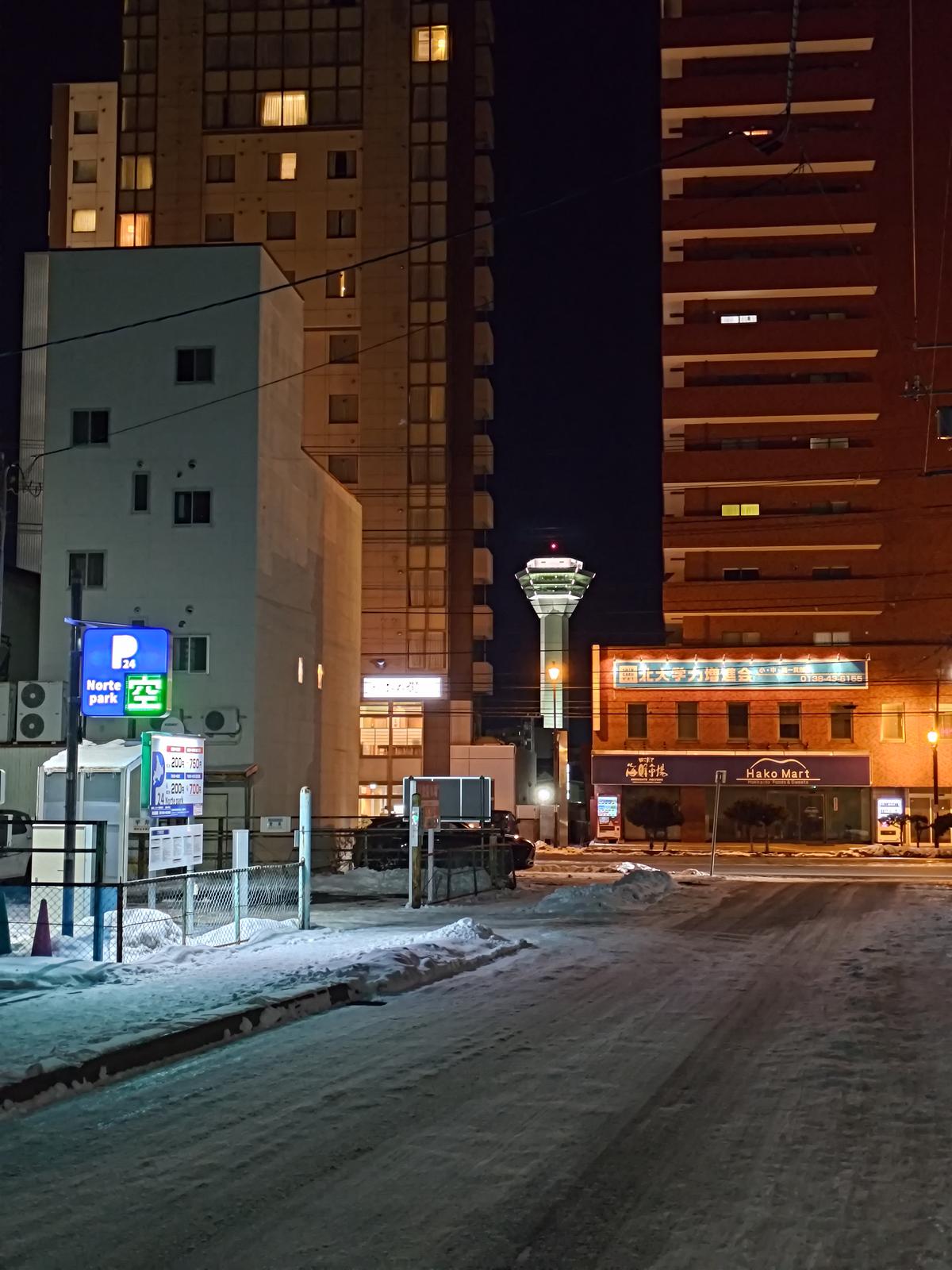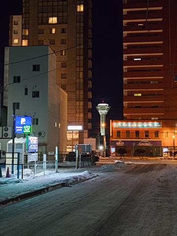 ホテルに着く直前でビルの隙間から五稜郭タワーのライトアップが見えました.