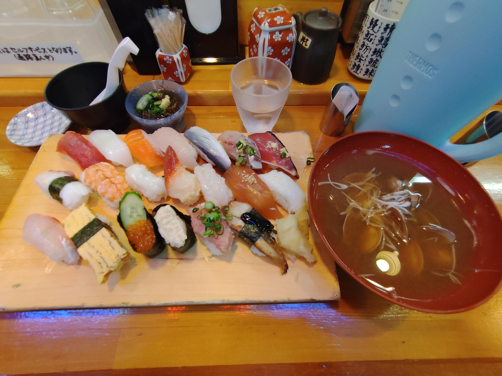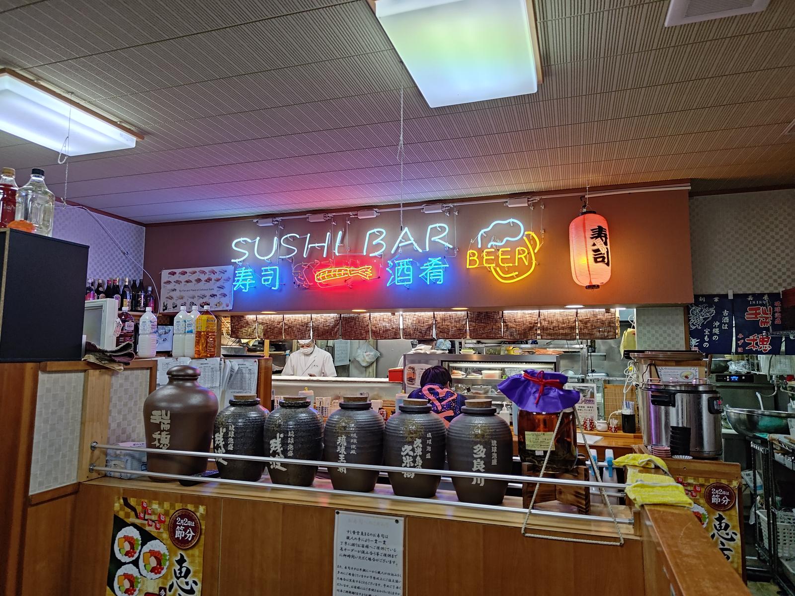メガ盛り@魚屋直営すし食堂 魚まる 2025/2/1(1年前) 旅, 沖縄, 食べ物 ホテルをチェックアウトして昼食を食べに出かけました. この日はあいにくの雨.ですが聞いてた通り沖縄では傘を差さない人の方が多かったです. 行ったのは魚屋直営すし食堂 魚まるという寿司や. 店内にインパクトのあるネオン. メガ盛りを頼んでがっつり寿司を堪能しました. 汁物はアサリ汁に変更しています.