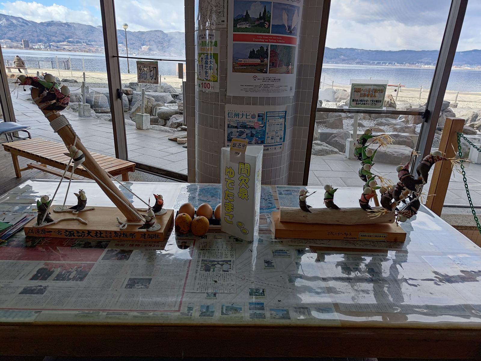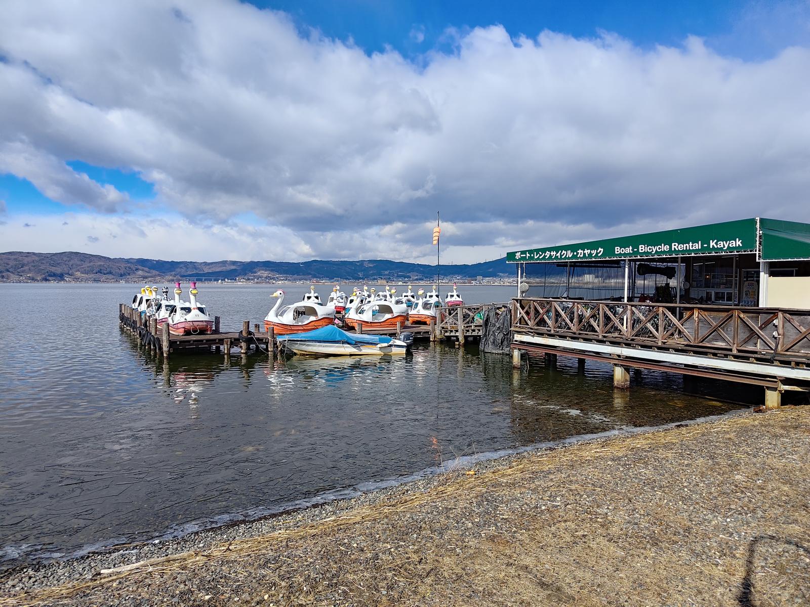 寒波が来てたので諏訪湖が凍ってないか来ていましたが全然でした.薄氷が岸辺にちょろっとある程度.