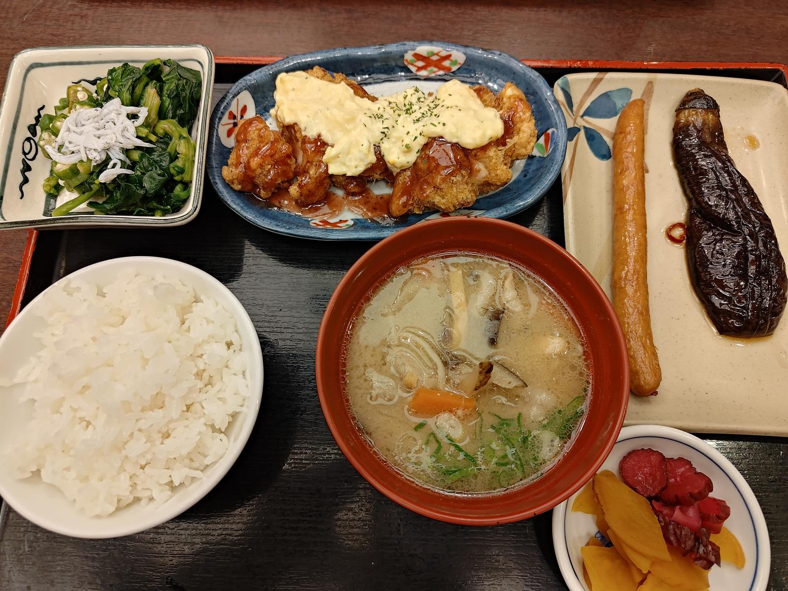 めしや食堂 2025/3/28(1年前) 京都, 近畿, 食べ物 この日の夕食は171号沿いにあるめしや食堂へ. 好きなおかずをとって最後に会計する方式です. チキン南蛮と豚汁とその他ちょこちょことりました.