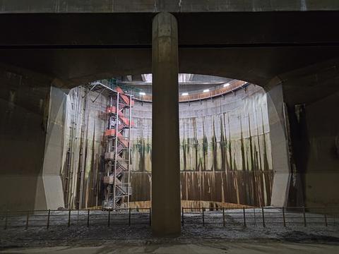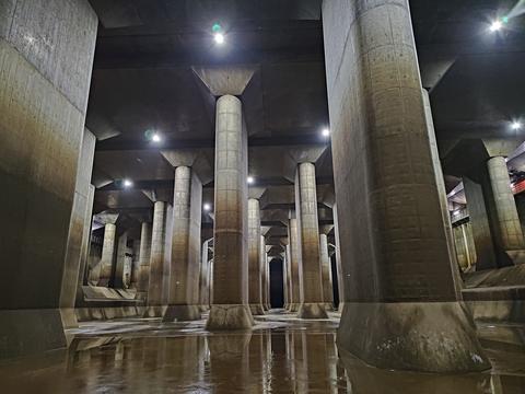 この巨大な柱は土の中にある調圧水槽が浮かび上がらないようにあるそうです.柱がないと水に入れた空気の入った桶のように浮いてしまうそうです.