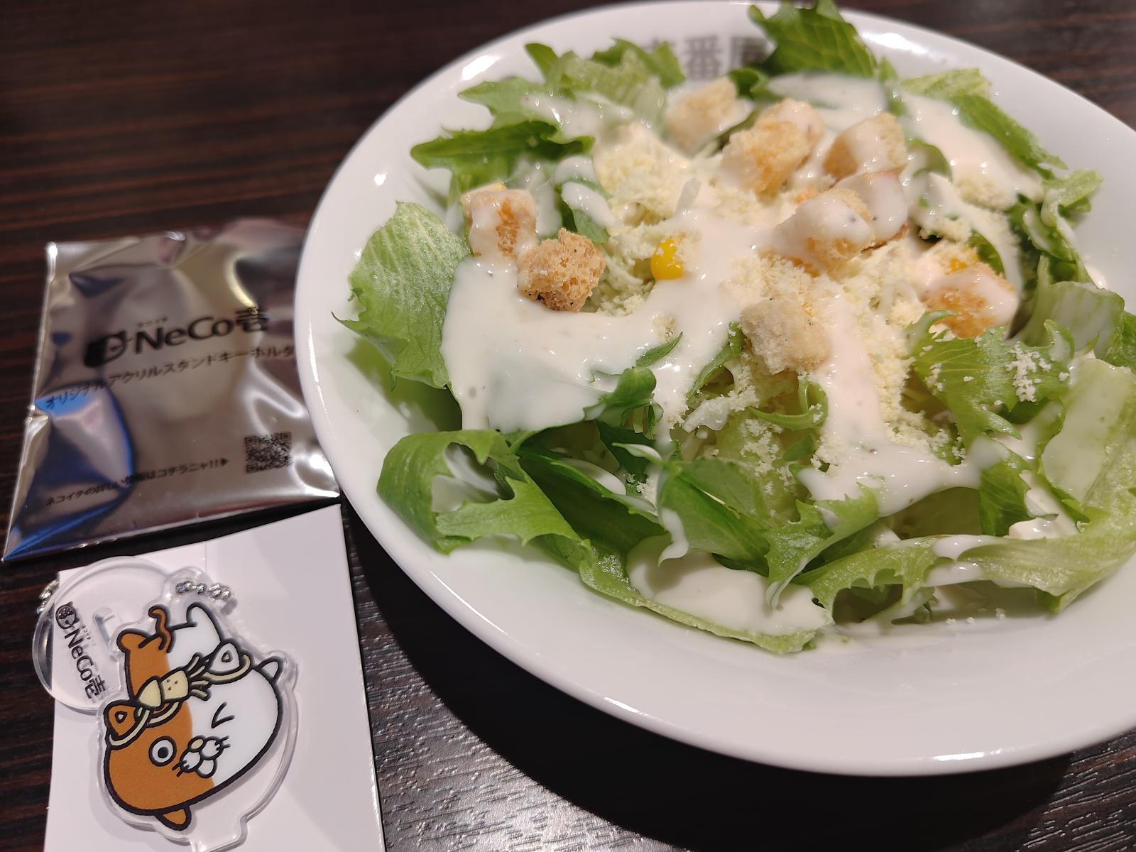 キーホルダーがオマケでついてくるシーザーサラダを注文.