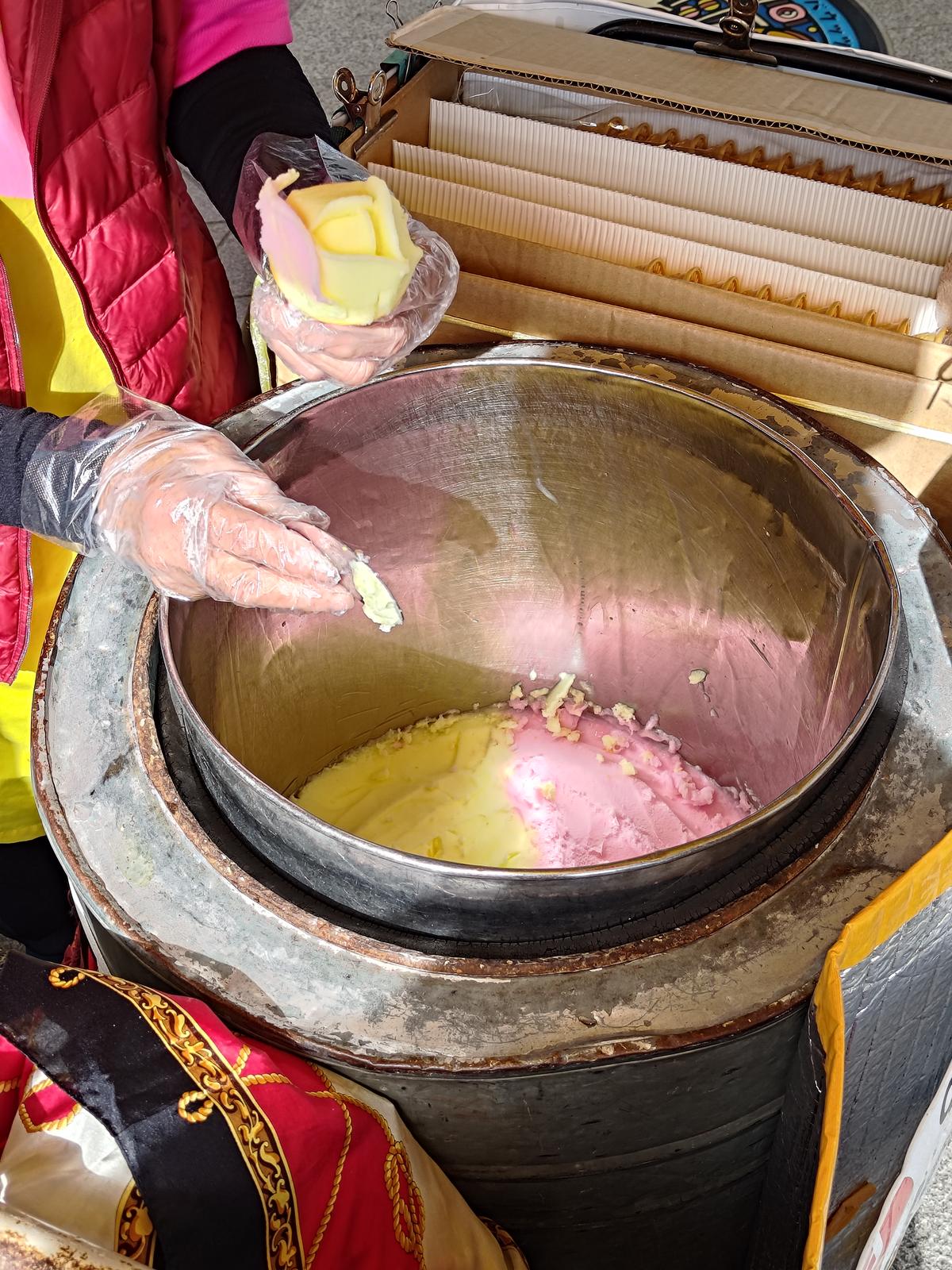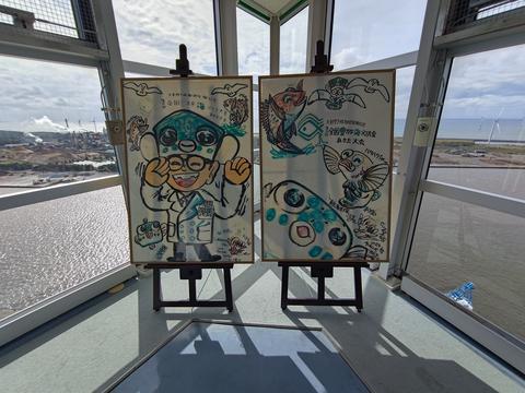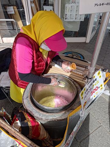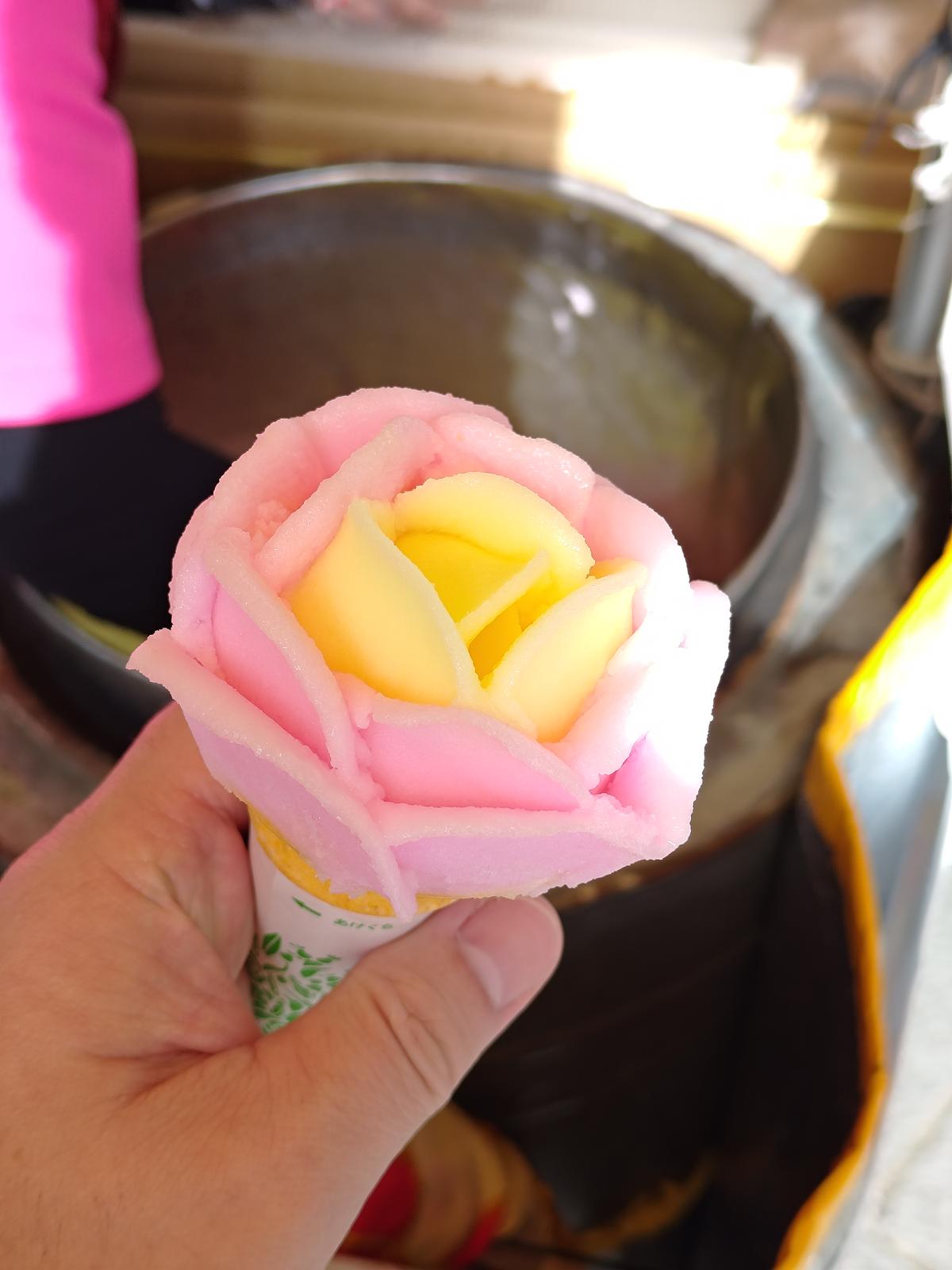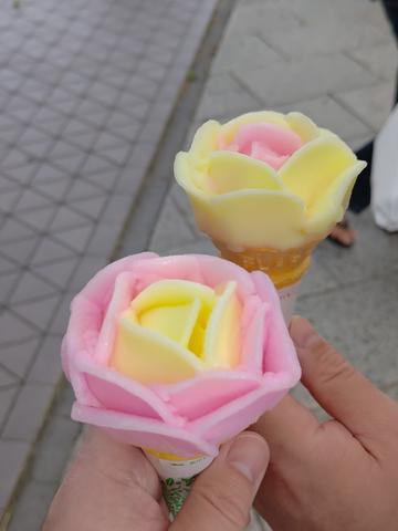 ババヘラアイス@ポートタワーセリオン 2025/10/19(6か月前) 旅, 東北, 秋田, 食べ物 秋田にはババヘラアイスという露店販売の氷菓子があるそうです. ポートタワーセリオンの前で販売していると聞いて行ってみました. 着いた時には販売所っぽいものはあれど人がいませんでしたが,すぐに戻ってきました. さっそくババヘラアイスをひとつ注文. ばばあがヘラで作るからババヘラアイス・・・親しみがこもっているのでしょうがすごい名前です. 完成. 素晴らしい造形です. 友人も注文. 色違いで作ってくれました. ポートタワーセリオンにも上りました. 素晴らしいことに無料です. かつてターミナルが合ったっぽい地形. ここにもサカナクンさん.