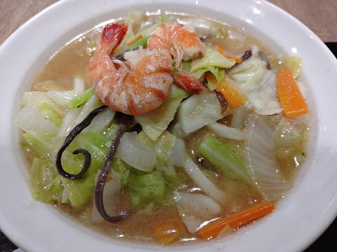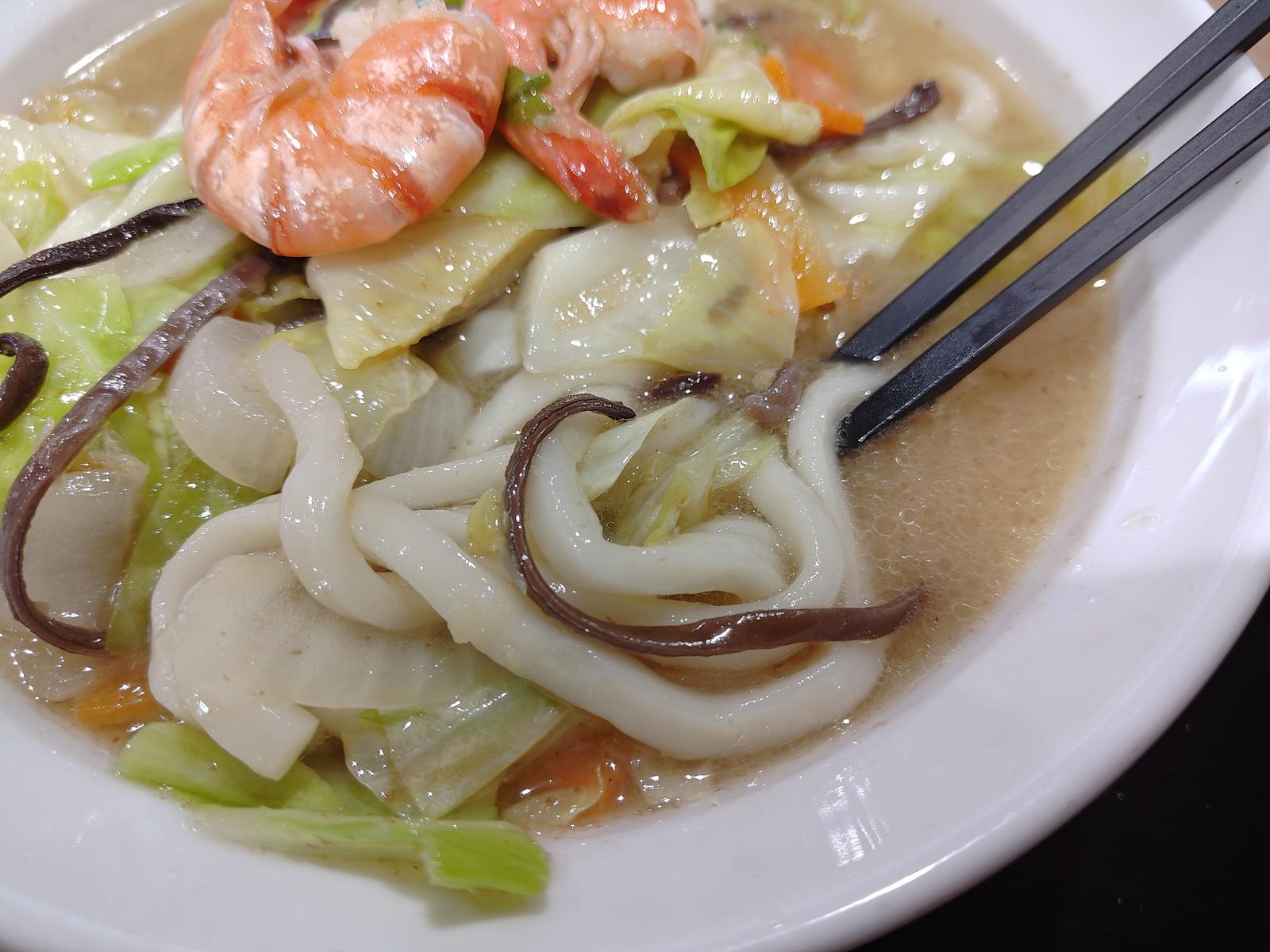 こちらが出てきたたろめん.見た目はちゃんぽんです.香ばしいにおいがして,エビが載ってて豪勢です.