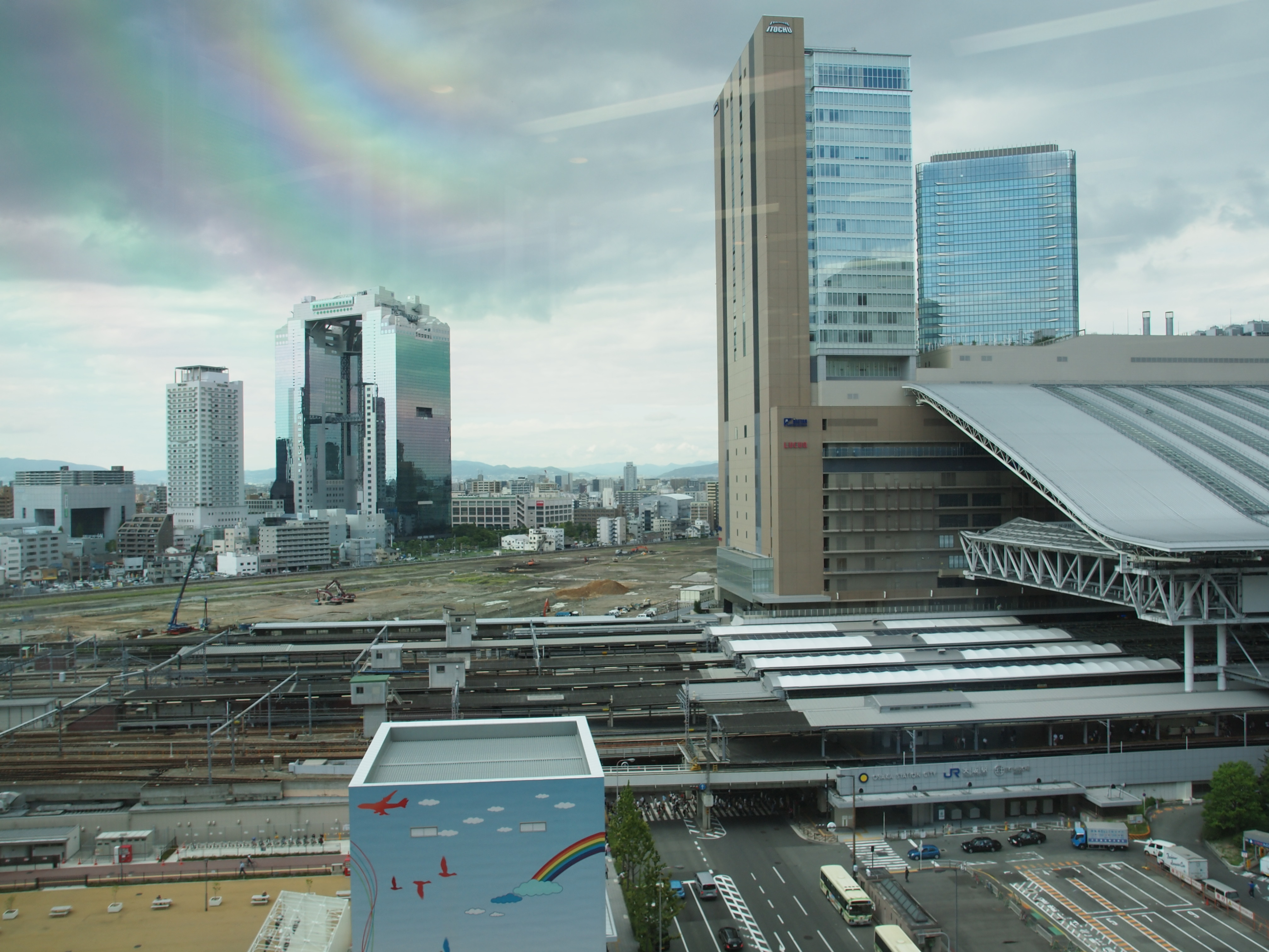 写真は献血ルームからの眺め.大阪駅を挟んで梅田スカイビルが見えます.