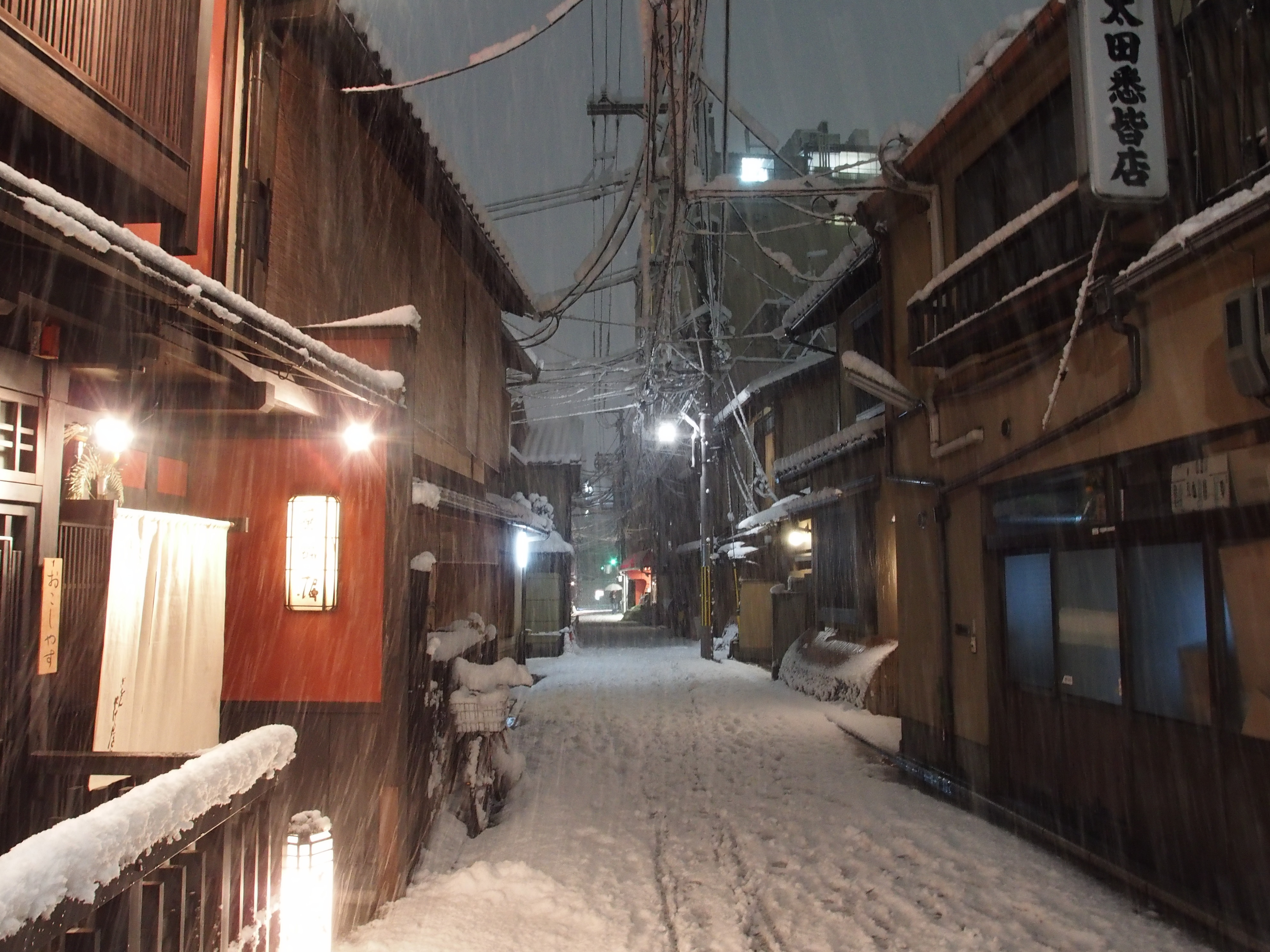 元日に大雪 2015/1/1(11年前) 京都, 日記 2015年の元旦は,すっきした青空でした. しかし昼を過ぎた頃に雪がちらついてきたかと思ったら,あっという間に積もってしまいました. こちらは午後6時頃の花見小路通の脇道の様子です.
