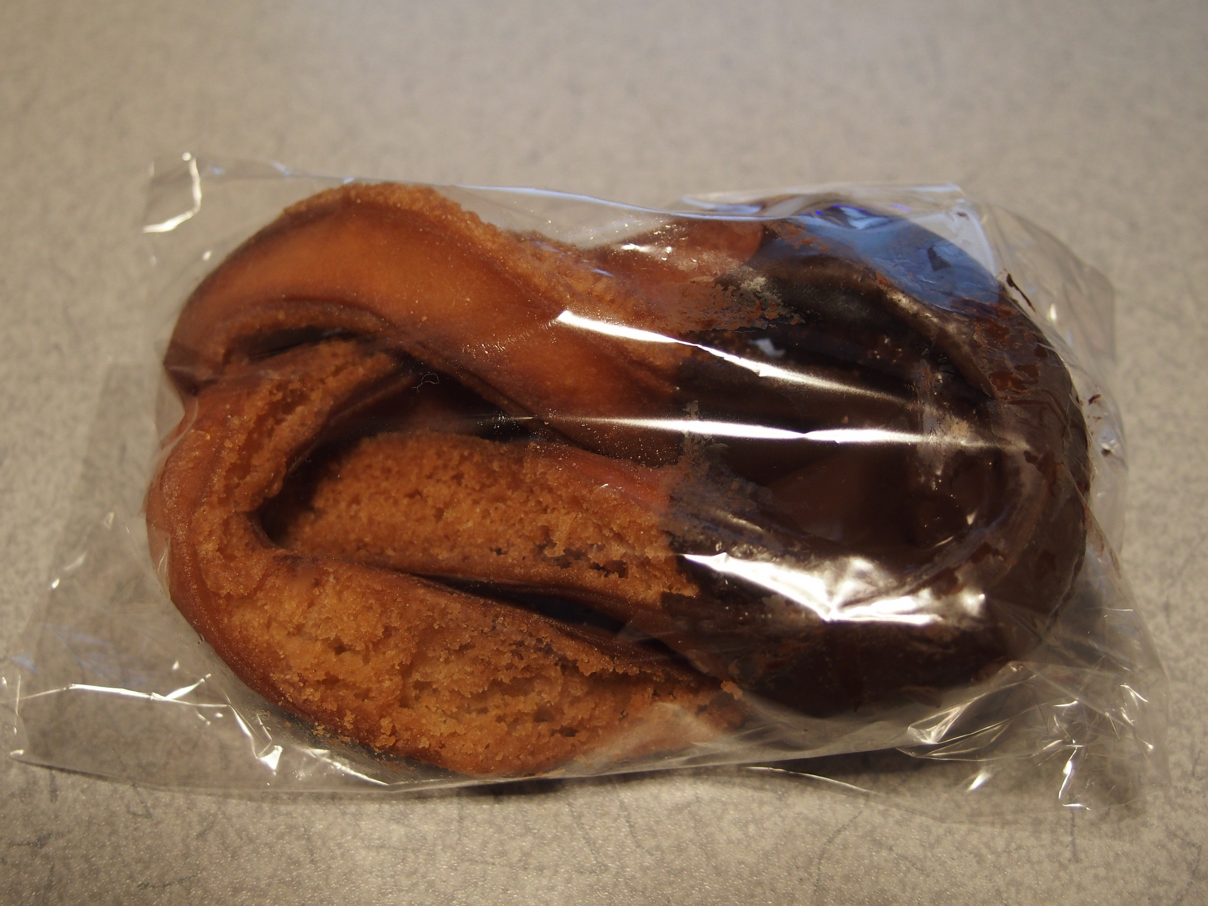 マンハッタン・ドーナツ 2016/4/3(10年前) 日記, 食べ物 近所の志津屋でとあるドーナツをよく買っていたのですが,あるとき売られなくなったので他の店で探してみたら見つかりませんでした. 再び売られるようになったので名前をちゃんと見たら「マンハッタン・ドーナツ」とありました. それをWebで調べたら,福岡の地域限定の食べ物とのこと.通りで某有名ドーナツショップとかで売ってないわけです. こちらがマンハッタン・ドーナツ.ねじれてて生地がハードでチョコがかかっています.