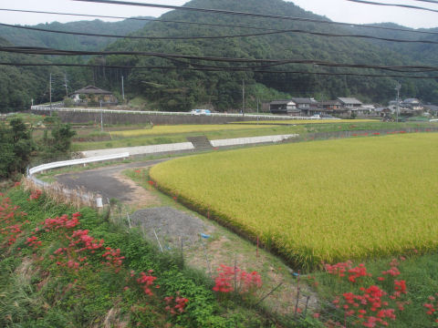 肥筑の鉄道旅~唐津線 2016/10/10(9年前) 九州, 佐賀 (2016年9月25日) 沿線の田園風景が美しいという,唐津線に乗りました. 稲が実って田んぼは黄金に染まっていき,時たま彼岸花も見られ,いい時期でした. 看板の奥に煉瓦の建造物があります.何でしょう. 乗った時からそこそこ席が埋まっていて自由に移動できませんでしたが,終盤の小城(おぎ)駅の辺りではさらに電車は降りるのも困難なほど乗客が乗っていました.