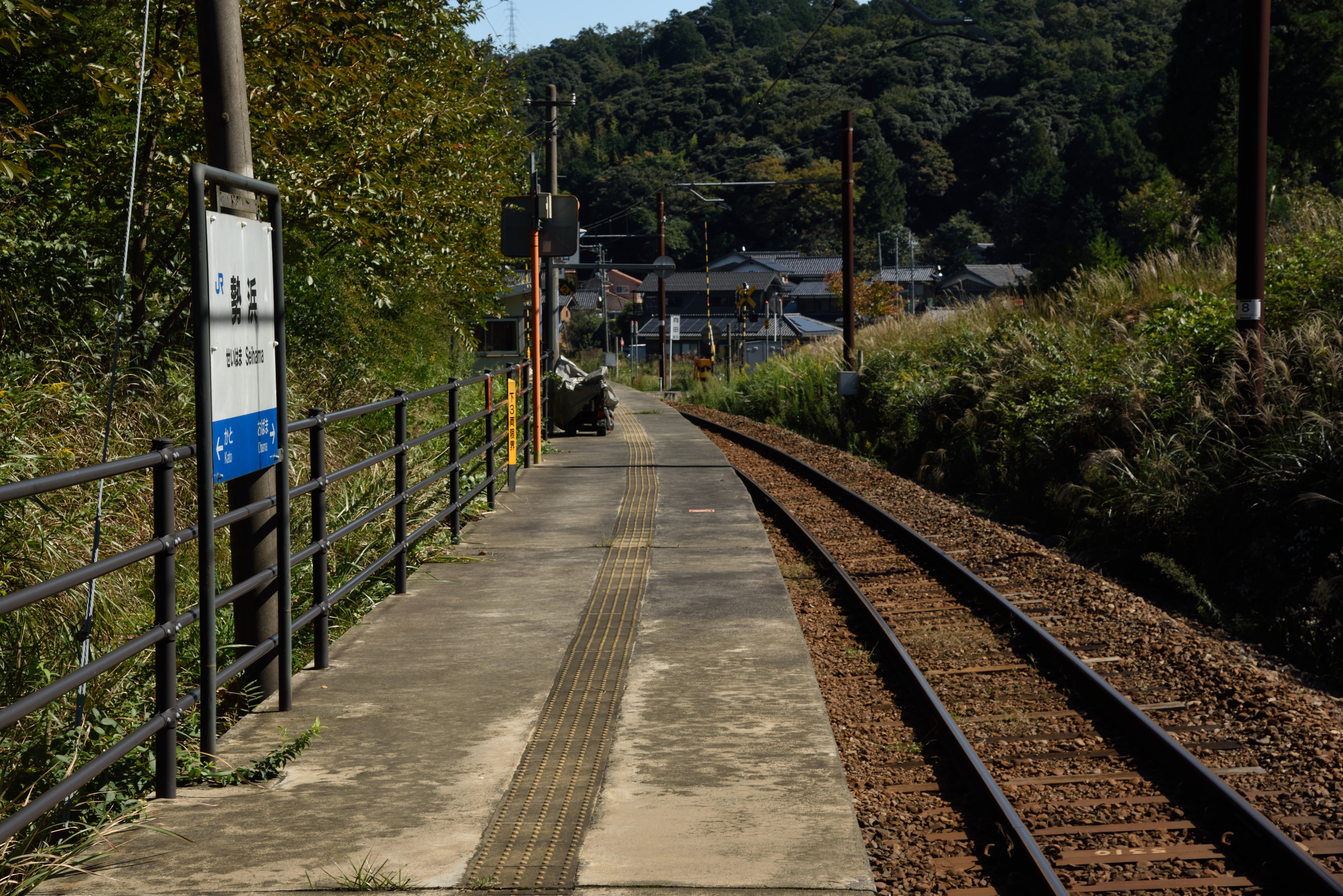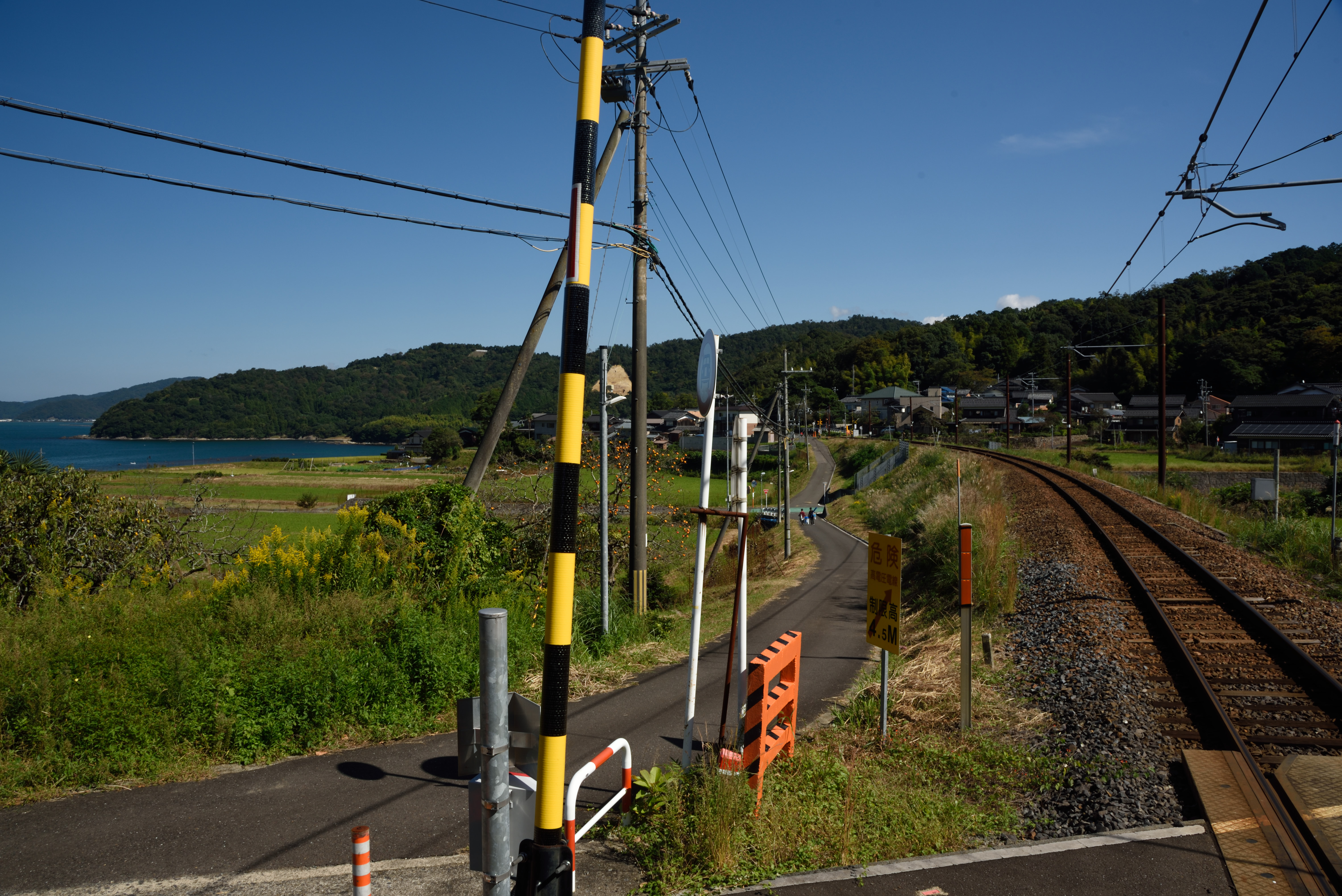 単線と踏切と水田といった田園風景越しに小浜湾が見えます.